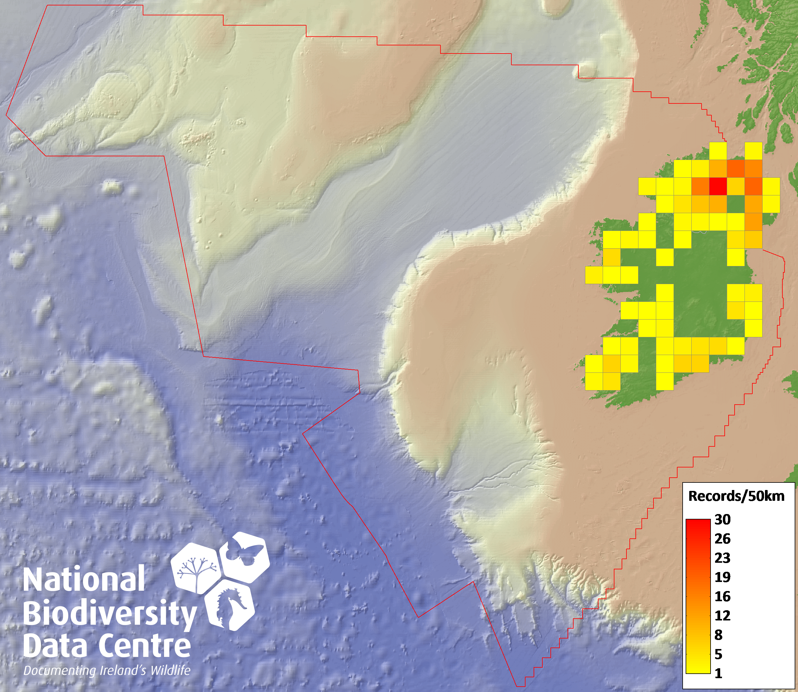 Distribution of the number of records recorded within each 10km grid square (ITM).Marine Map - 50km