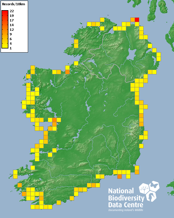 Distribution of the number of records recorded within each 10km grid square (ITM).Marine Map - 50km