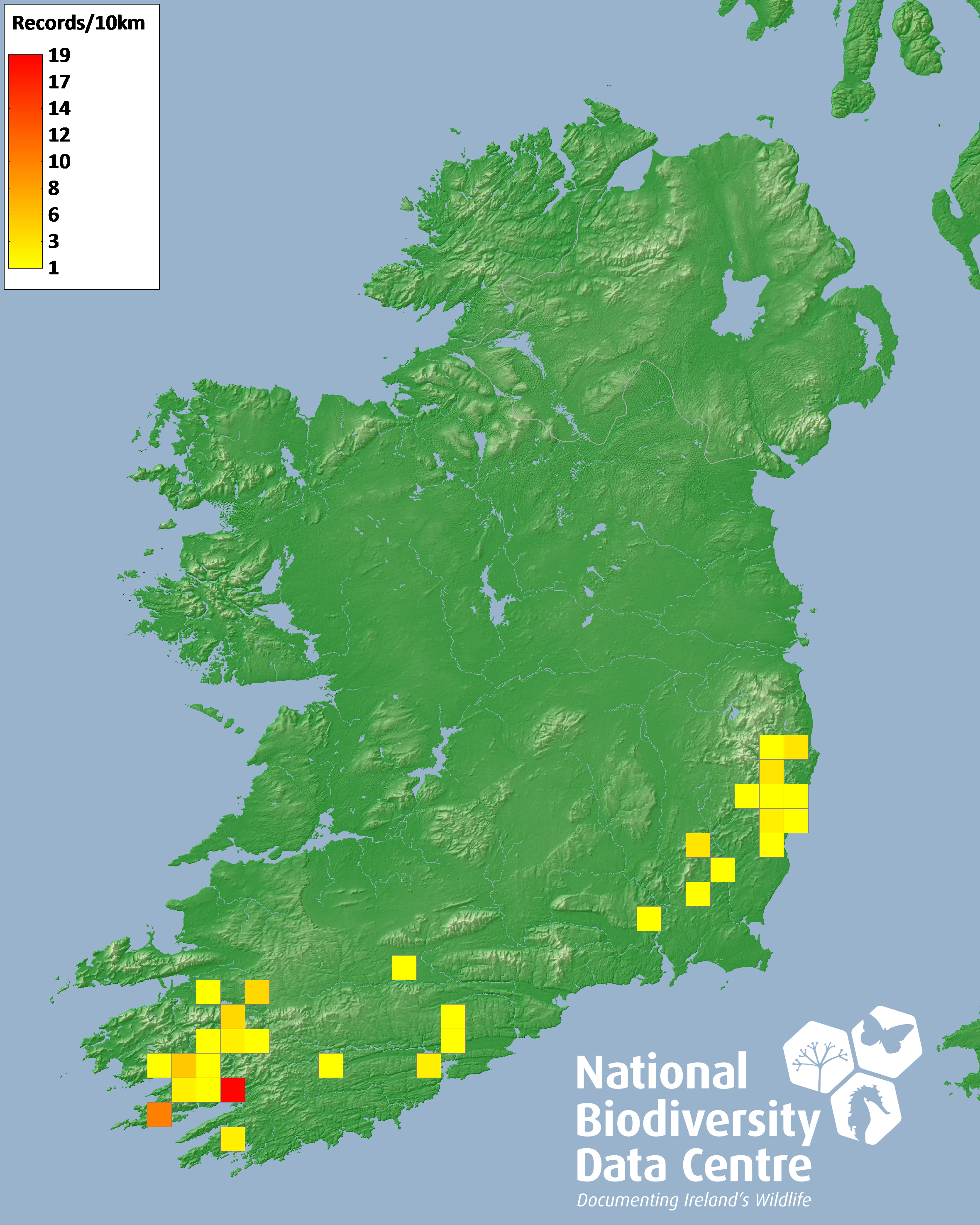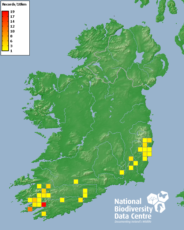 Distribution of the number of records recorded within each 10km grid square (ITM).Marine Map - 50km