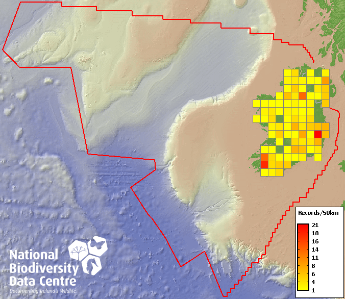Distribution of the number of records recorded within each 10km grid square (ITM).Marine Map - 50km