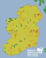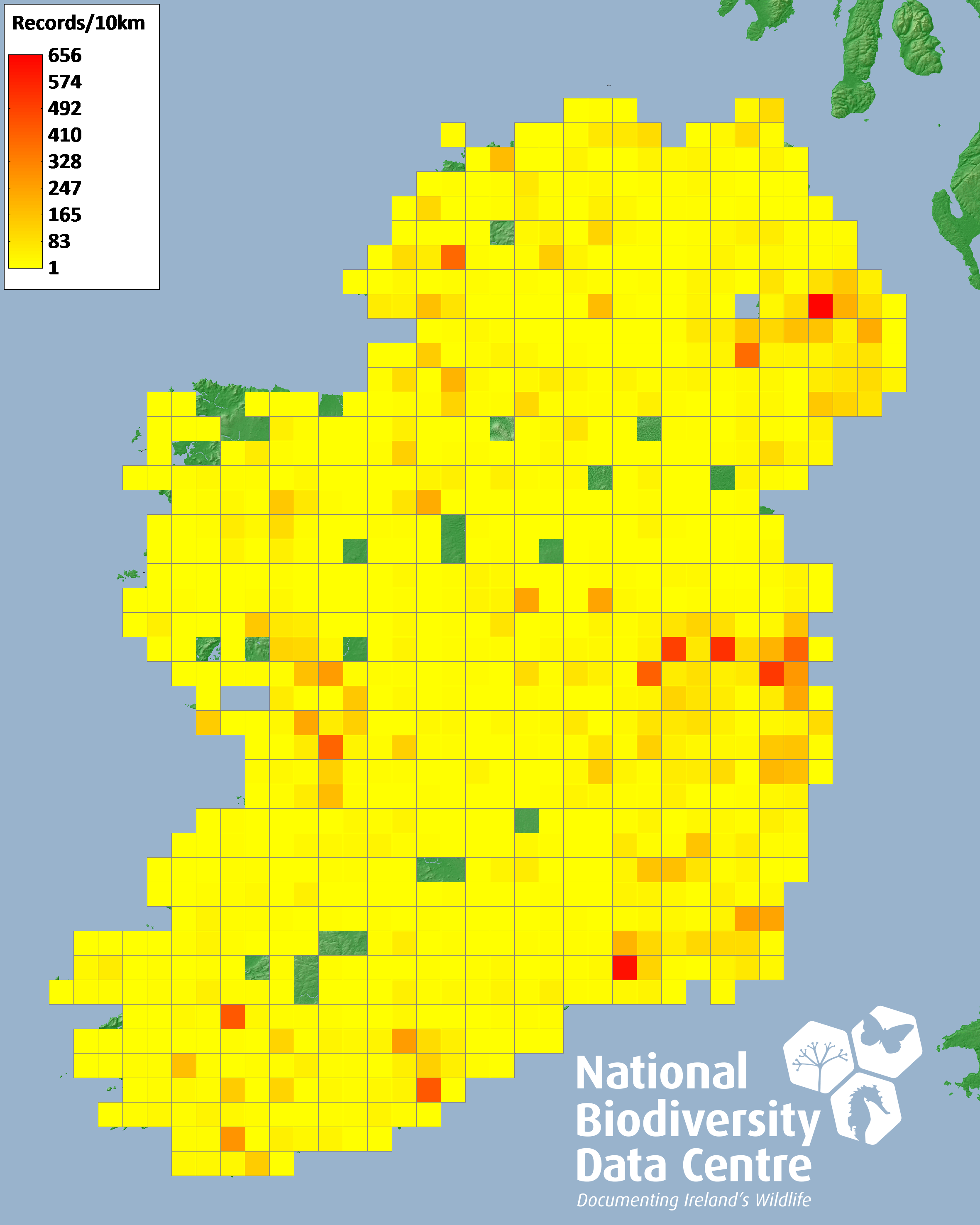 Distribution of the number of records recorded within each 10km grid square (ITM).Marine Map - 50km