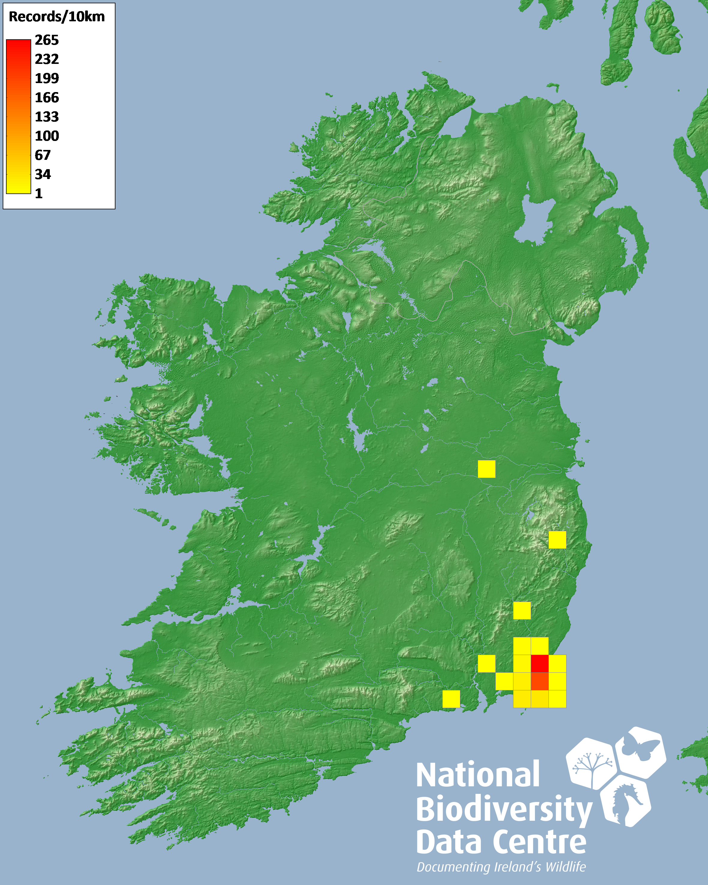 Distribution of the number of records recorded within each 10km grid square (ITM).Marine Map - 50km