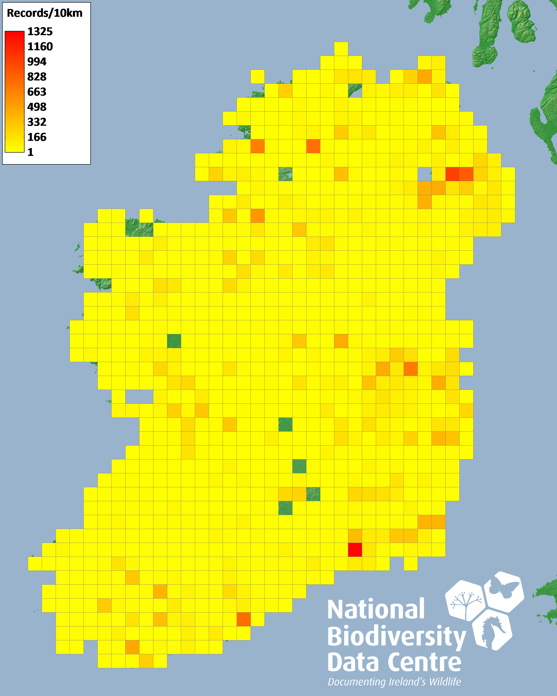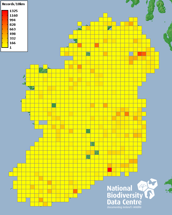 Distribution of the number of records recorded within each 10km grid square (ITM).Marine Map - 50km