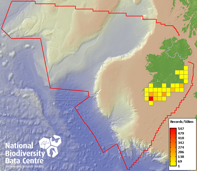 Distribution of the number of records recorded within each 10km grid square (ITM).Marine Map - 50km