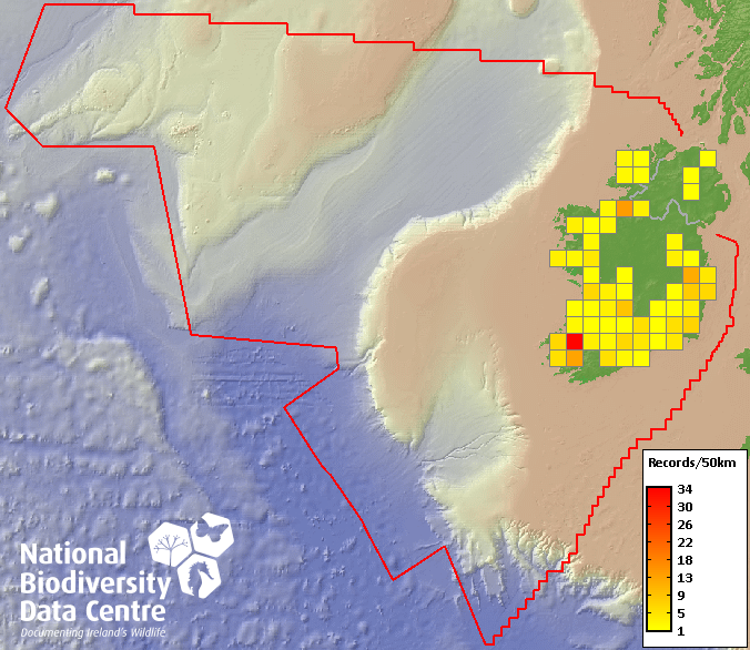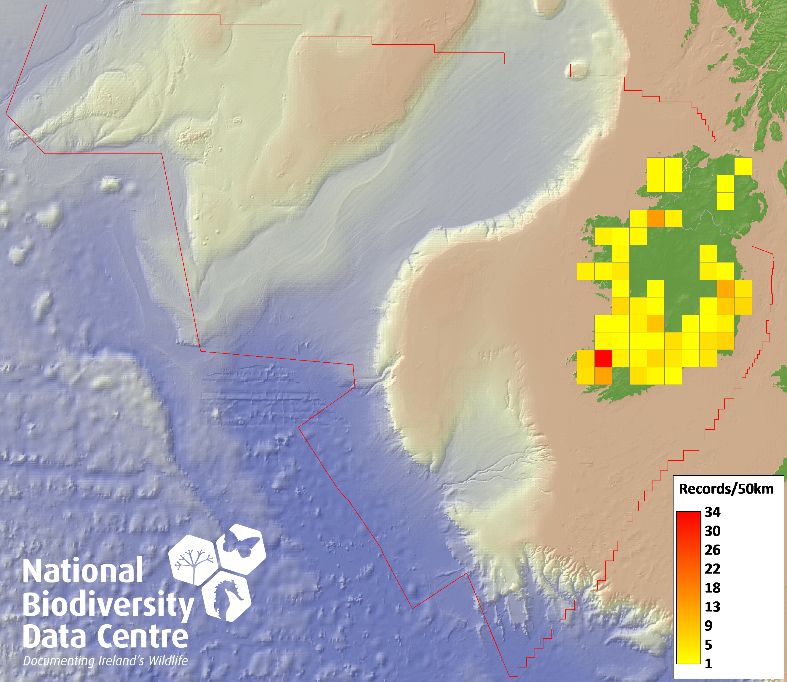 Distribution of the number of records recorded within each 10km grid square (ITM).Marine Map - 50km