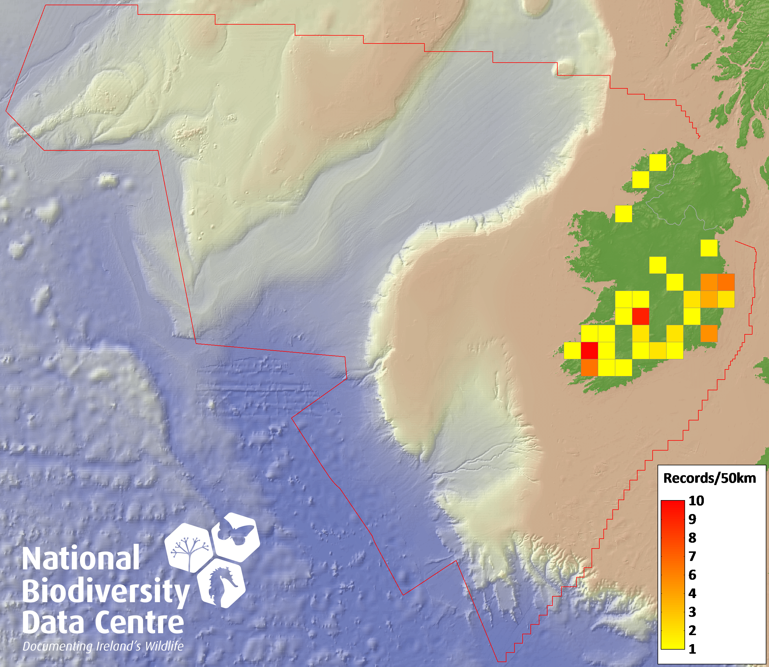 Distribution of the number of records recorded within each 10km grid square (ITM).Marine Map - 50km