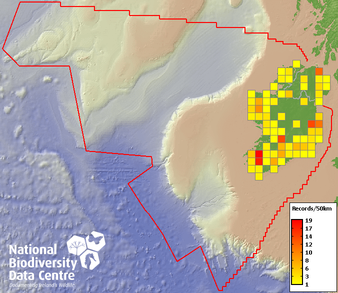 Distribution of the number of records recorded within each 10km grid square (ITM).Marine Map - 50km