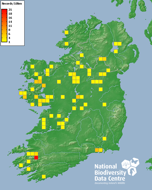 Distribution of the number of records recorded within each 10km grid square (ITM).Marine Map - 50km