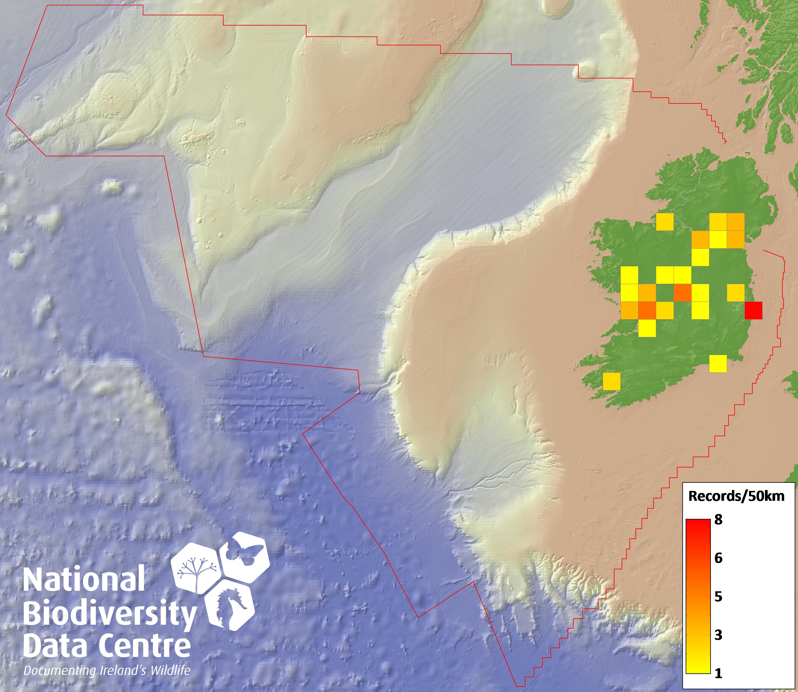 Distribution of the number of records recorded within each 10km grid square (ITM).Marine Map - 50km