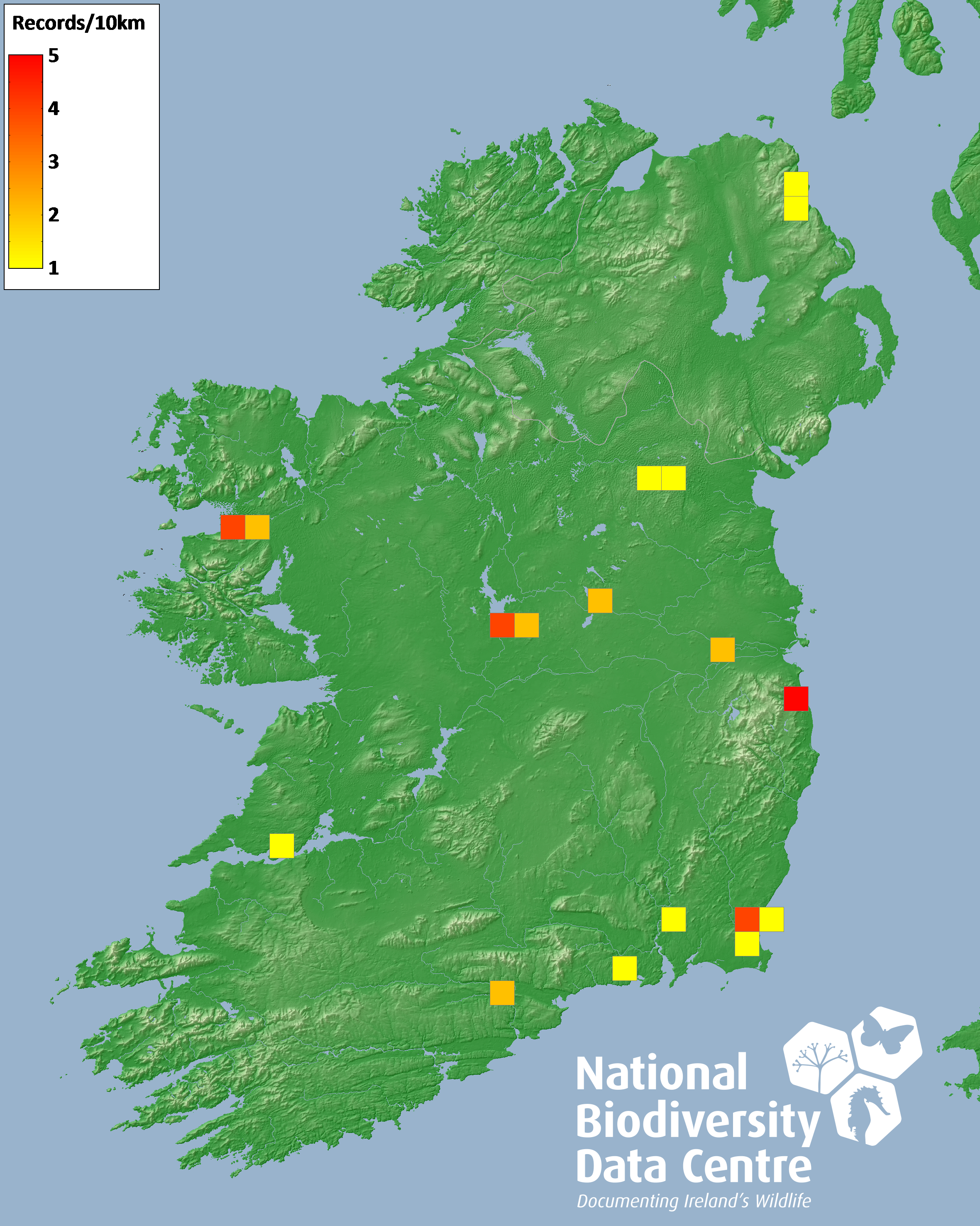Distribution of the number of records recorded within each 10km grid square (ITM).Marine Map - 50km
