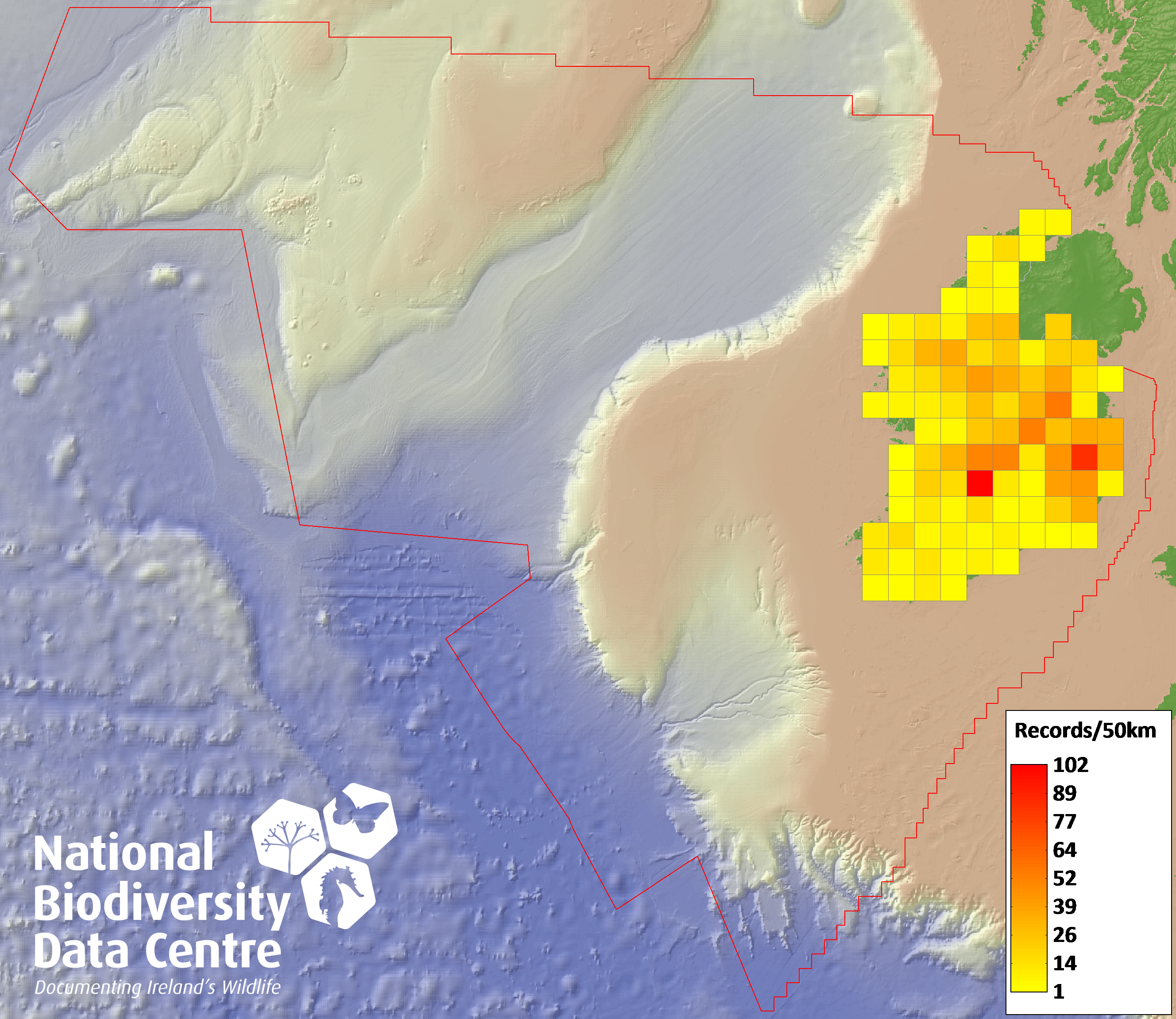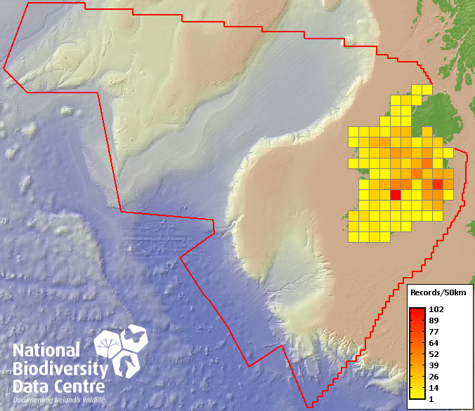Distribution of the number of records recorded within each 10km grid square (ITM).Marine Map - 50km