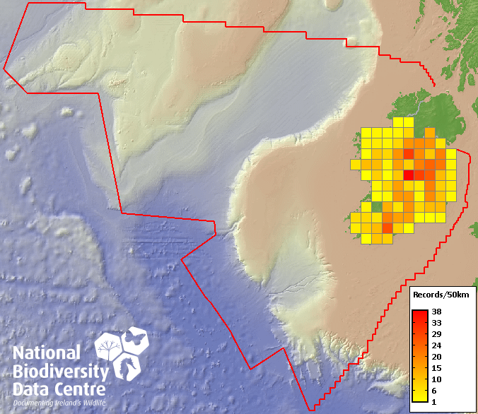 Distribution of the number of records recorded within each 10km grid square (ITM).Marine Map - 50km