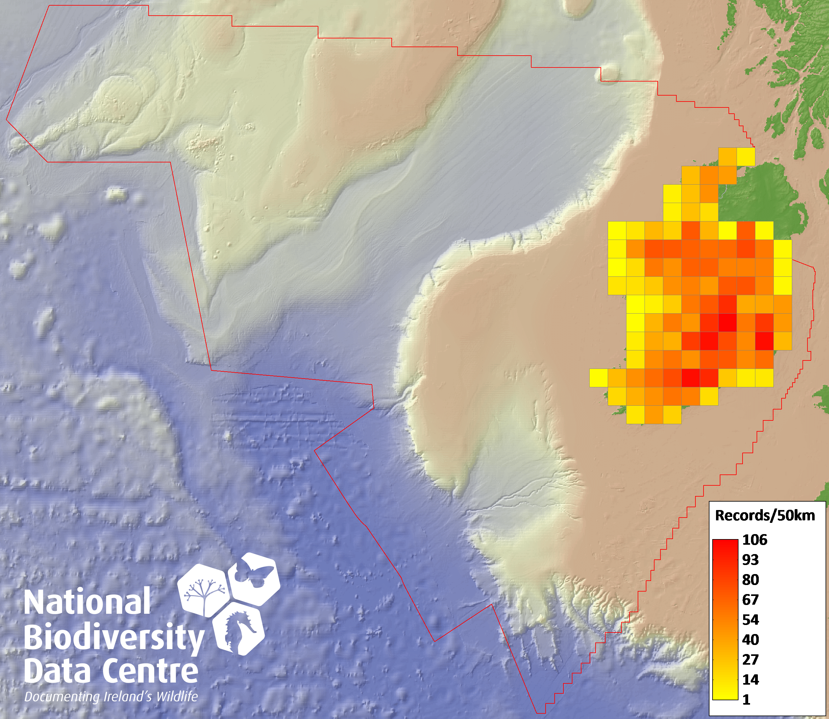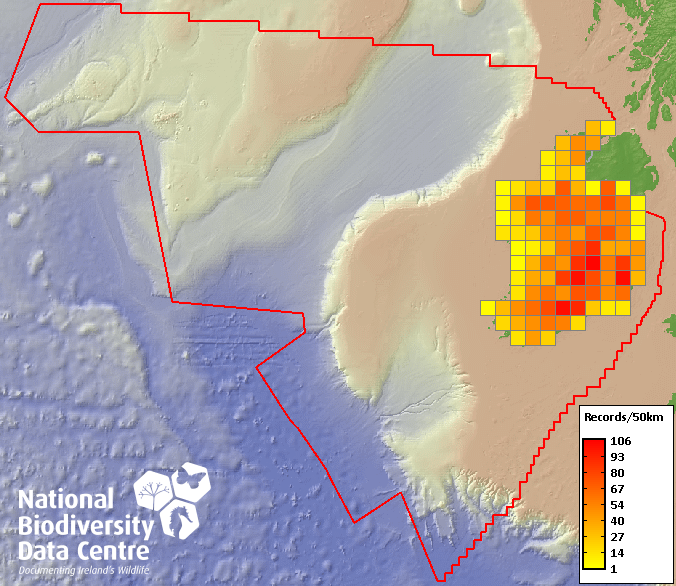 Distribution of the number of records recorded within each 10km grid square (ITM).Marine Map - 50km