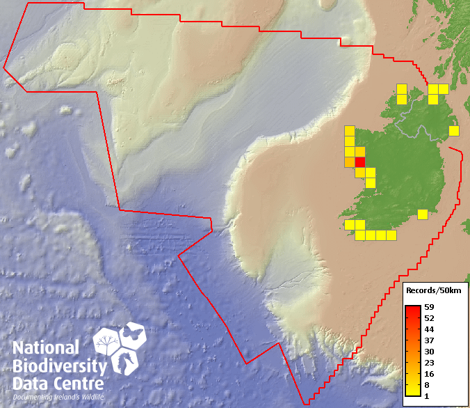 Distribution of the number of records recorded within each 10km grid square (ITM).Marine Map - 50km