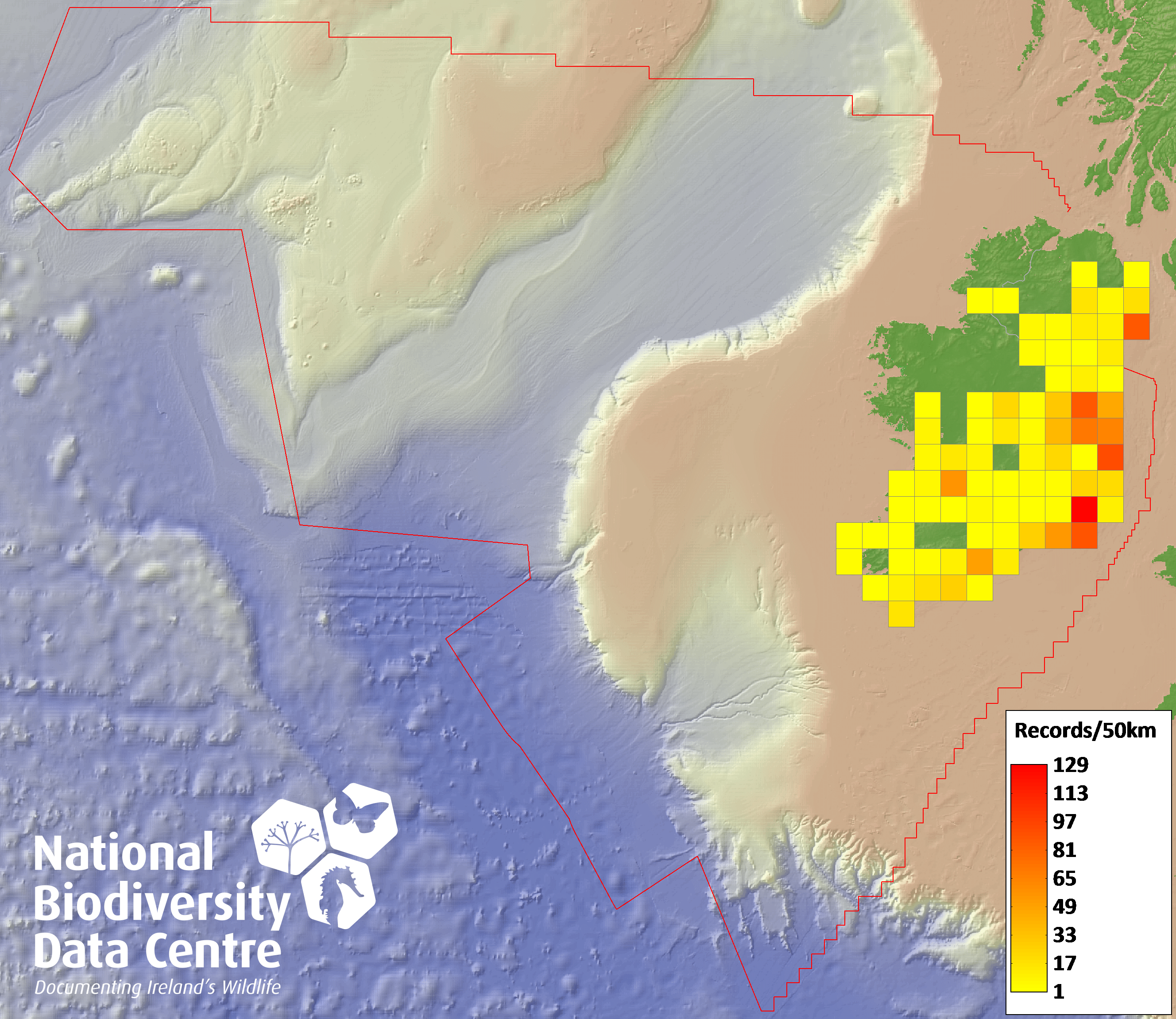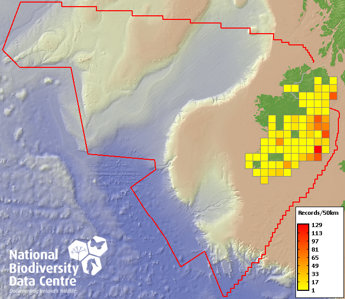Distribution of the number of records recorded within each 10km grid square (ITM).Marine Map - 50km