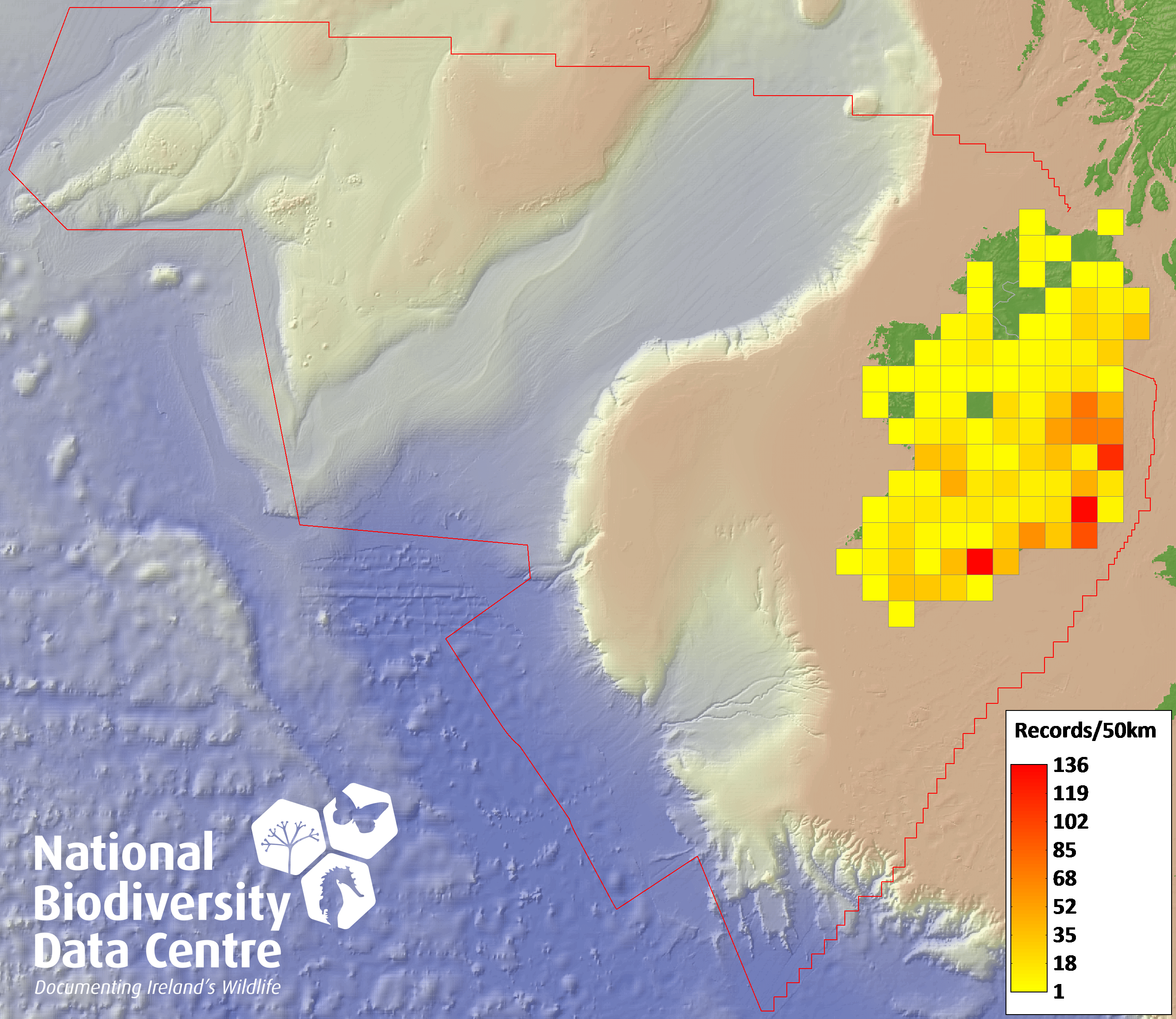 Distribution of the number of records recorded within each 10km grid square (ITM).Marine Map - 50km