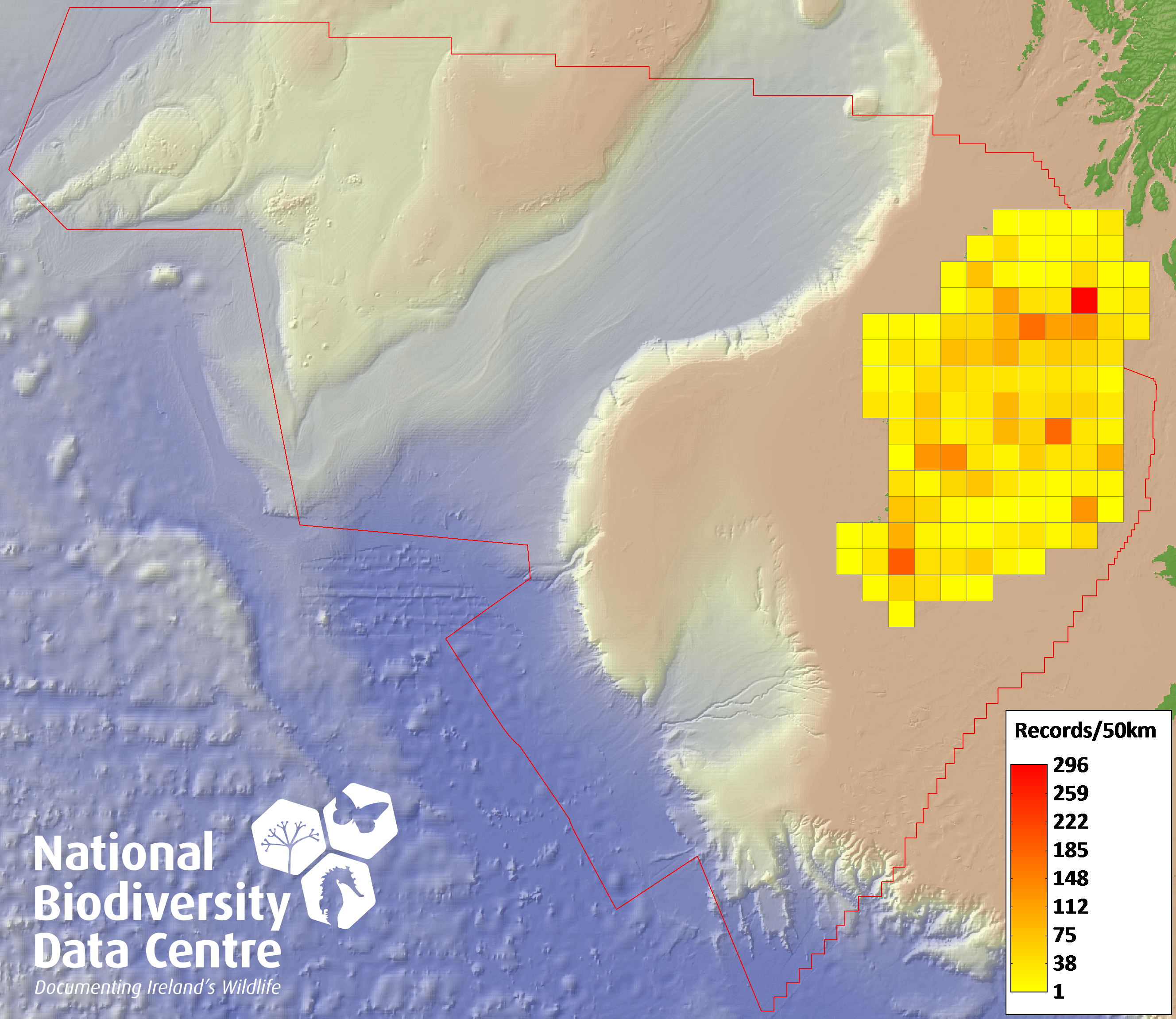 Distribution of the number of records recorded within each 10km grid square (ITM).Marine Map - 50km