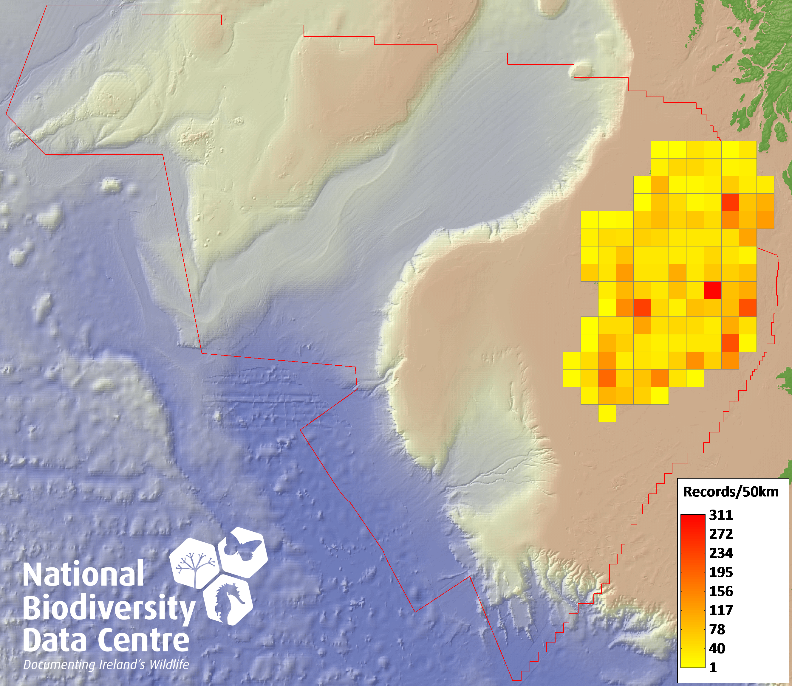 Distribution of the number of records recorded within each 10km grid square (ITM).Marine Map - 50km
