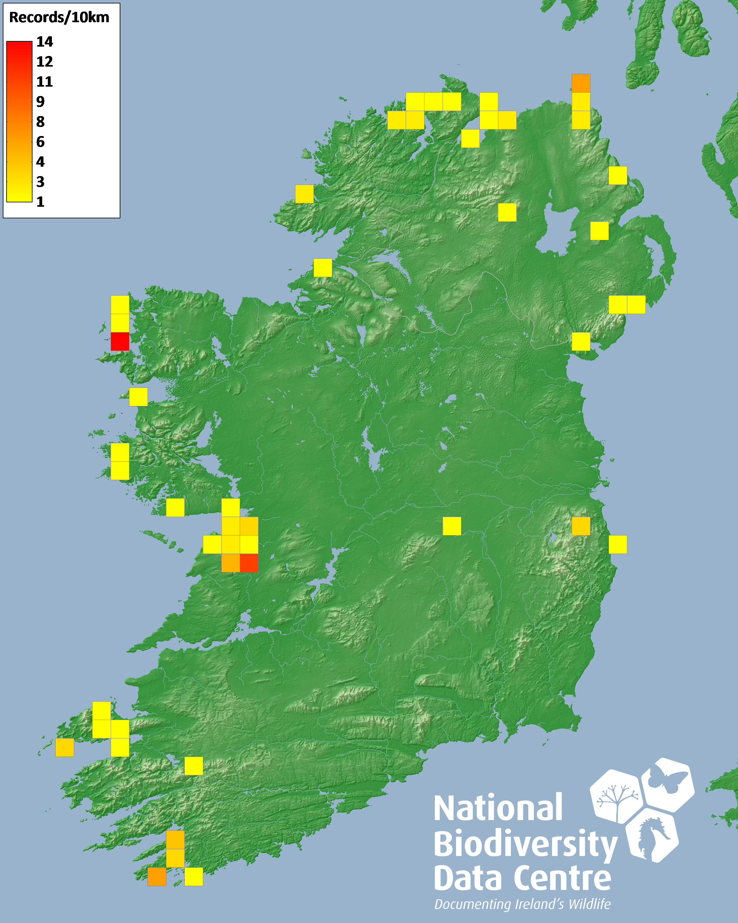 Distribution of the number of records recorded within each 10km grid square (ITM).Marine Map - 50km