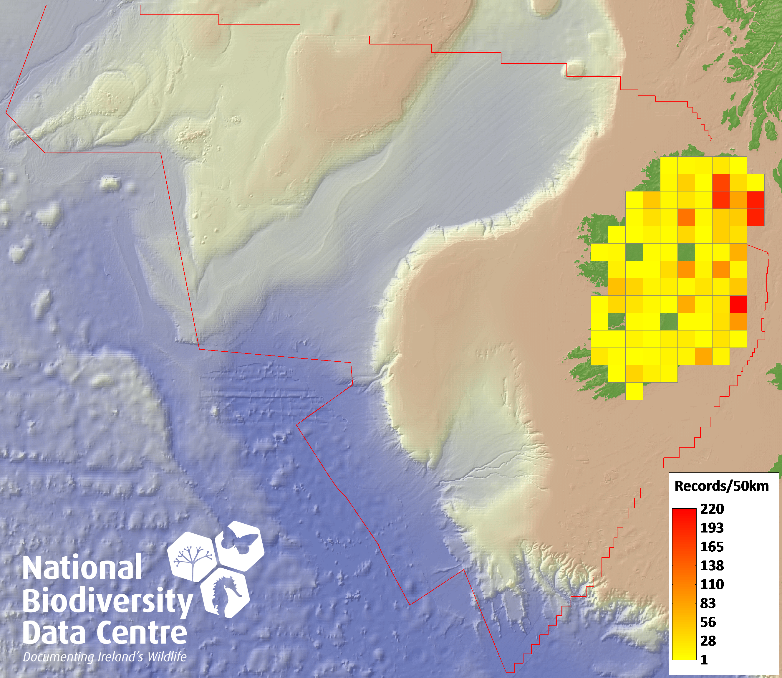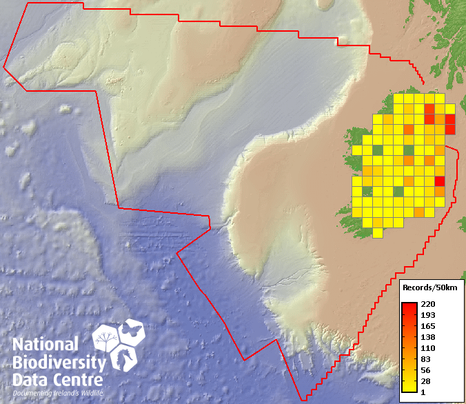 Distribution of the number of records recorded within each 10km grid square (ITM).Marine Map - 50km