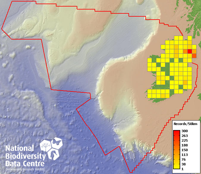 Distribution of the number of records recorded within each 10km grid square (ITM).Marine Map - 50km