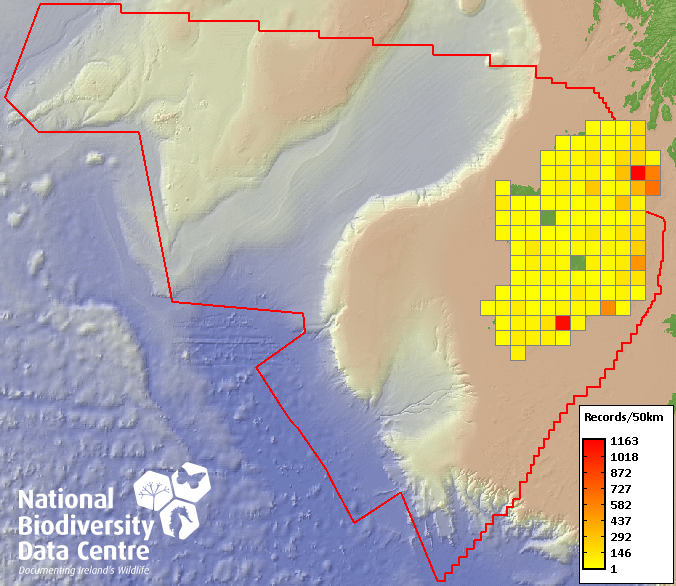 Distribution of the number of records recorded within each 10km grid square (ITM).Marine Map - 50km