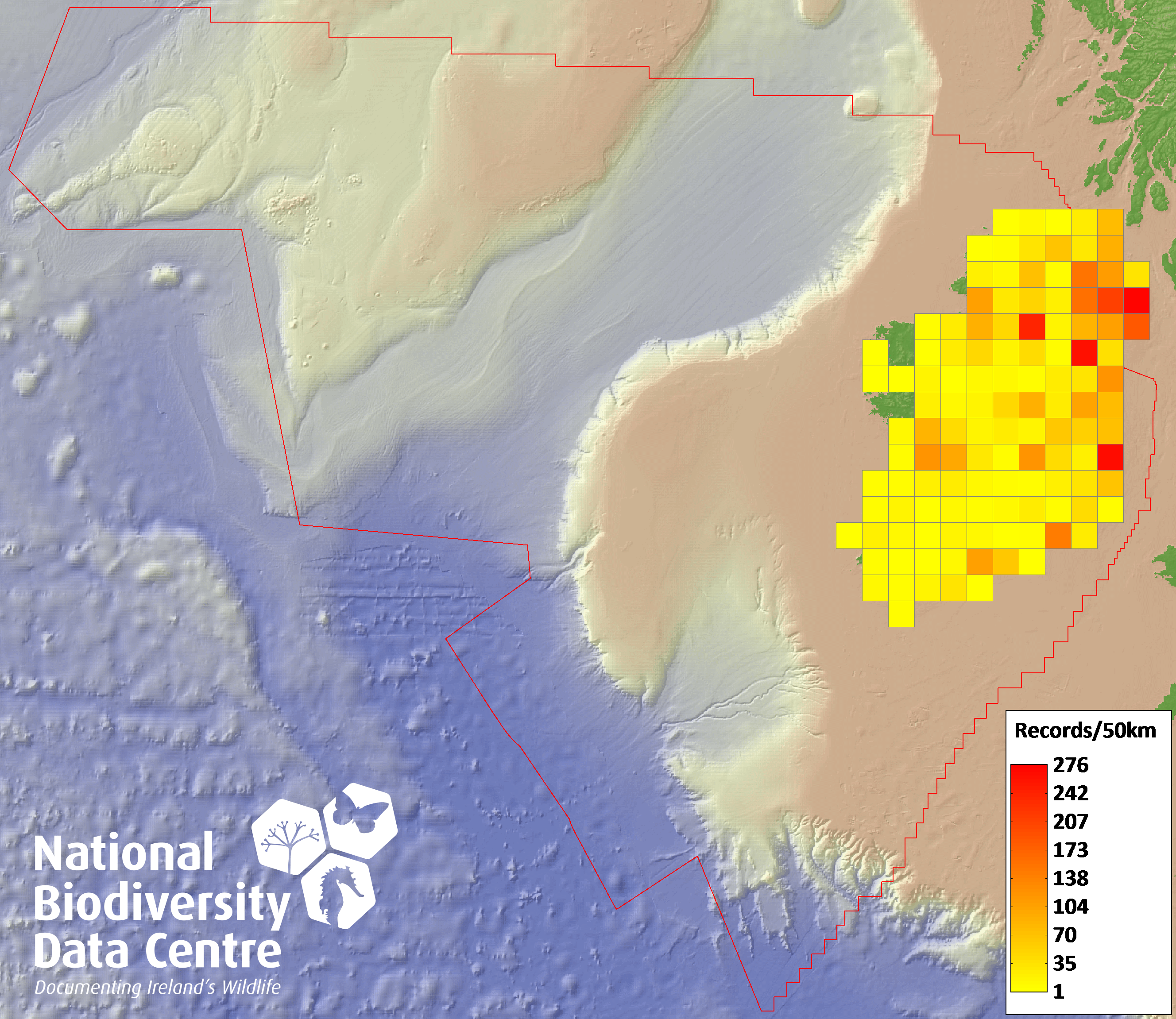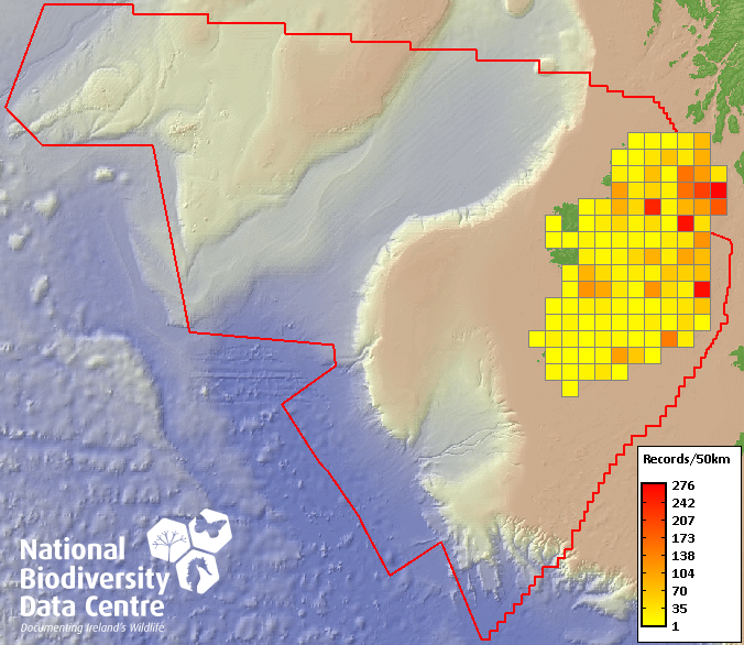 Distribution of the number of records recorded within each 10km grid square (ITM).Marine Map - 50km