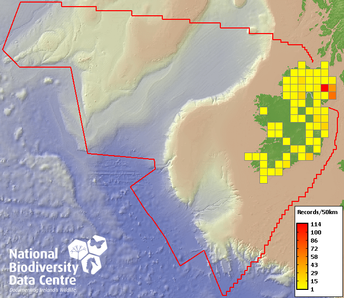 Distribution of the number of records recorded within each 10km grid square (ITM).Marine Map - 50km