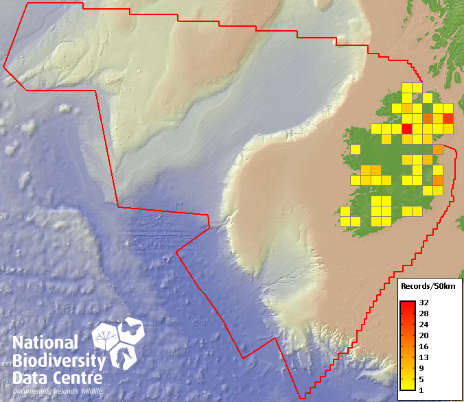 Distribution of the number of records recorded within each 10km grid square (ITM).Marine Map - 50km