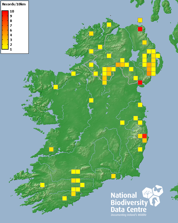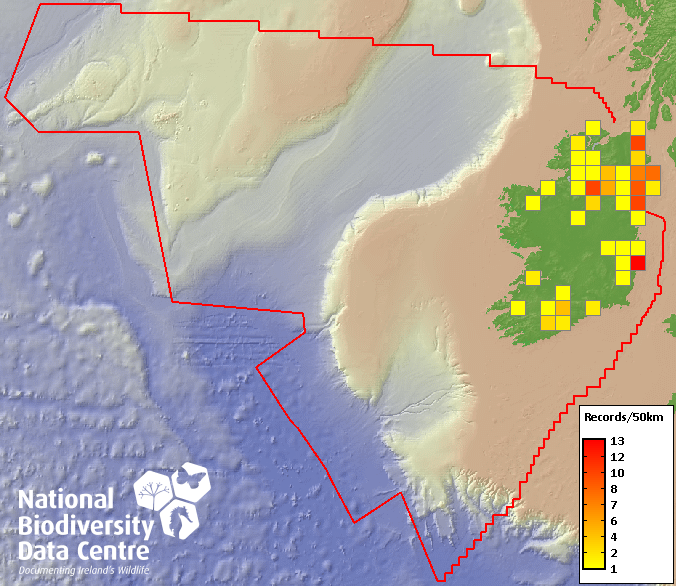 Distribution of the number of records recorded within each 10km grid square (ITM).Marine Map - 50km