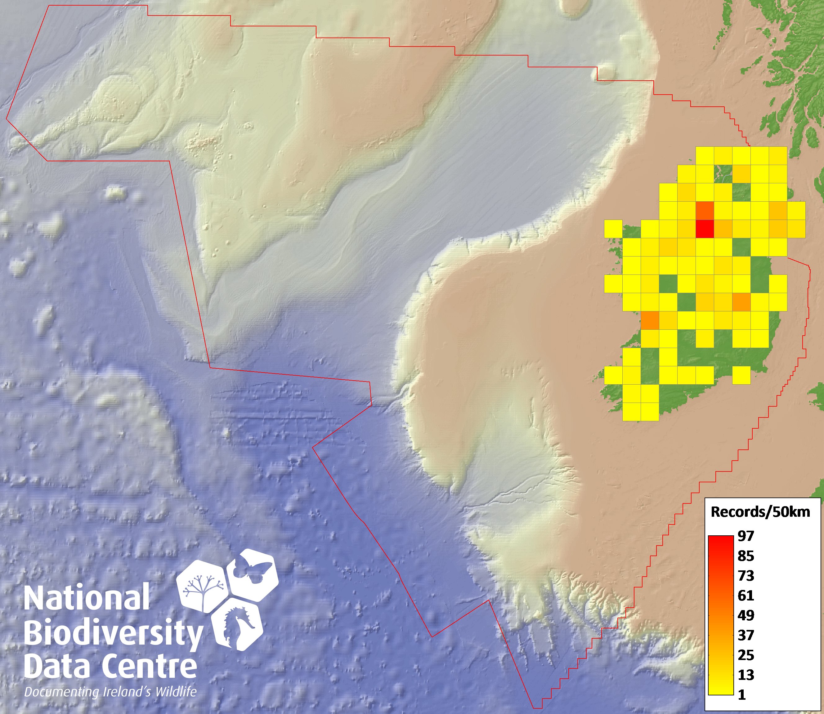 Distribution of the number of records recorded within each 10km grid square (ITM).Marine Map - 50km