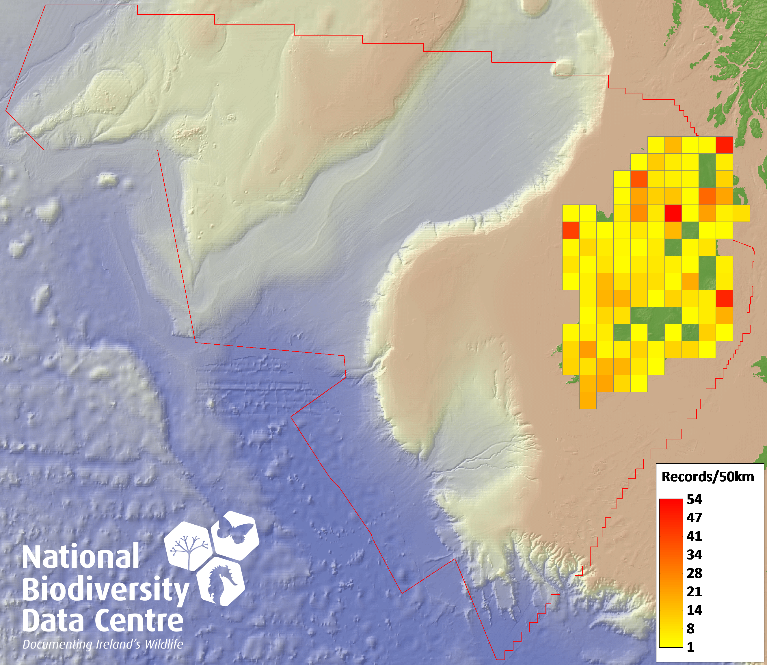 Distribution of the number of records recorded within each 10km grid square (ITM).Marine Map - 50km