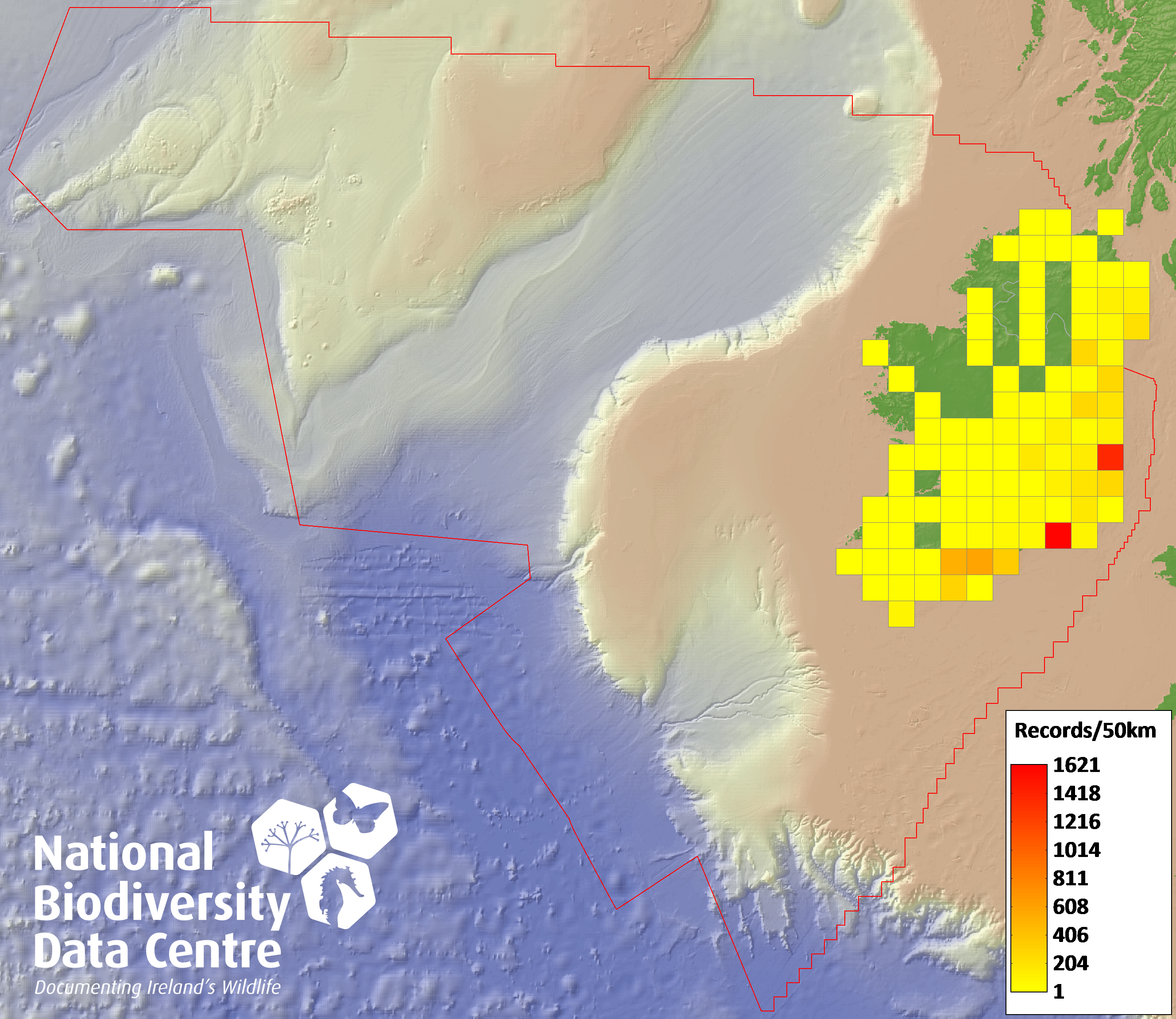 Distribution of the number of records recorded within each 10km grid square (ITM).Marine Map - 50km