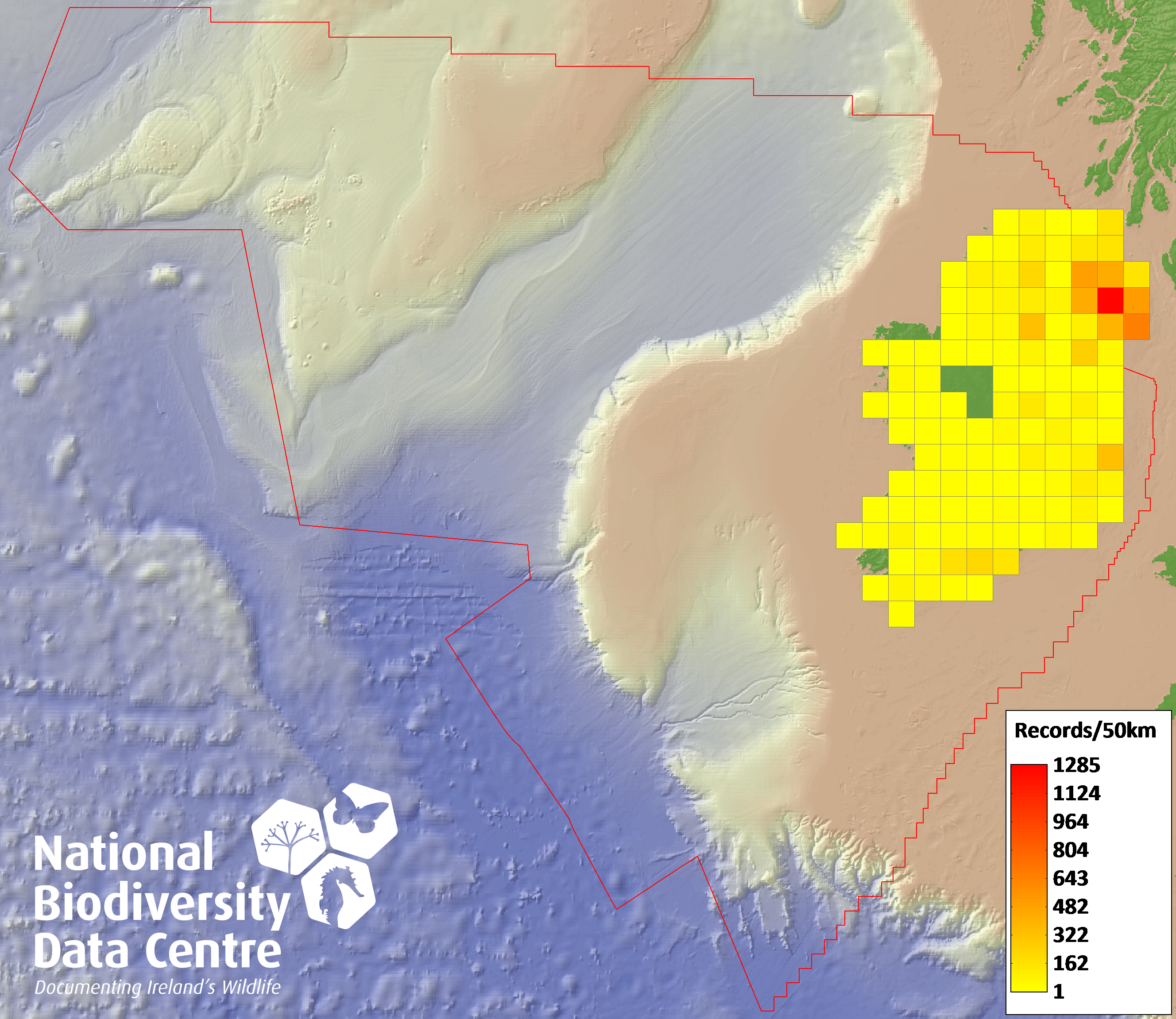 Distribution of the number of records recorded within each 10km grid square (ITM).Marine Map - 50km