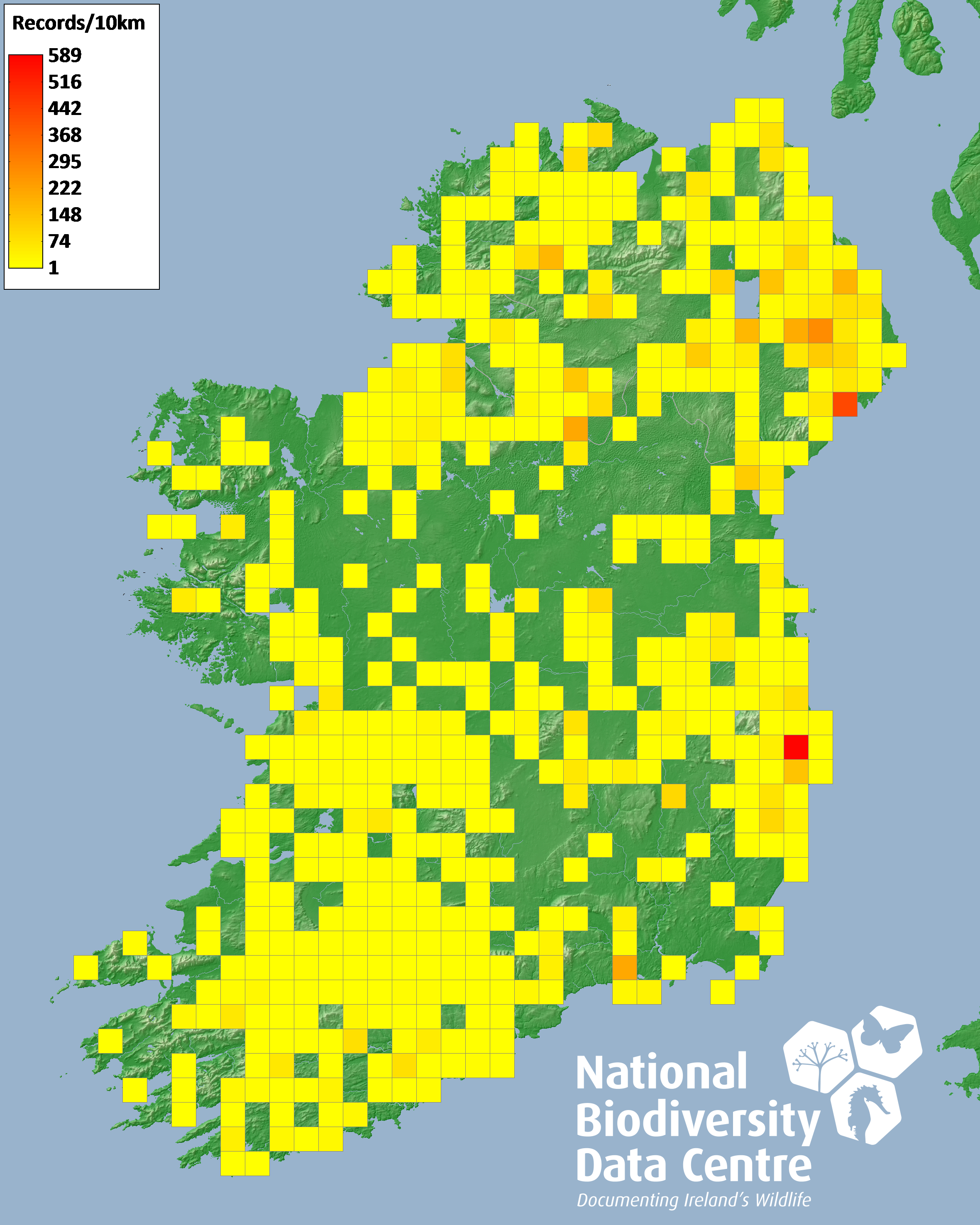 Distribution of the number of records recorded within each 10km grid square (ITM).Marine Map - 50km