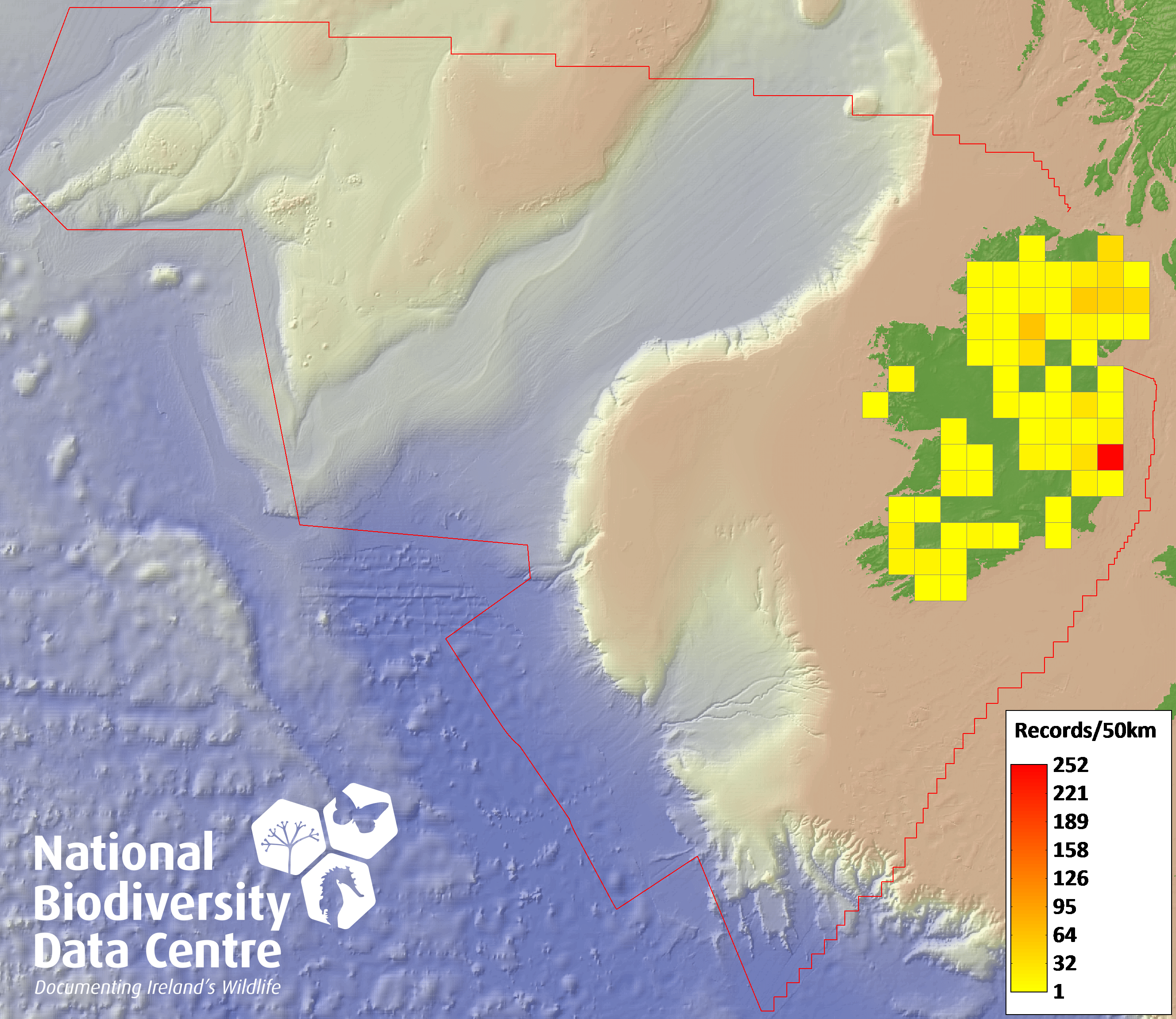 Distribution of the number of records recorded within each 10km grid square (ITM).Marine Map - 50km