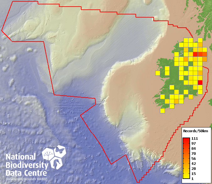Distribution of the number of records recorded within each 10km grid square (ITM).Marine Map - 50km
