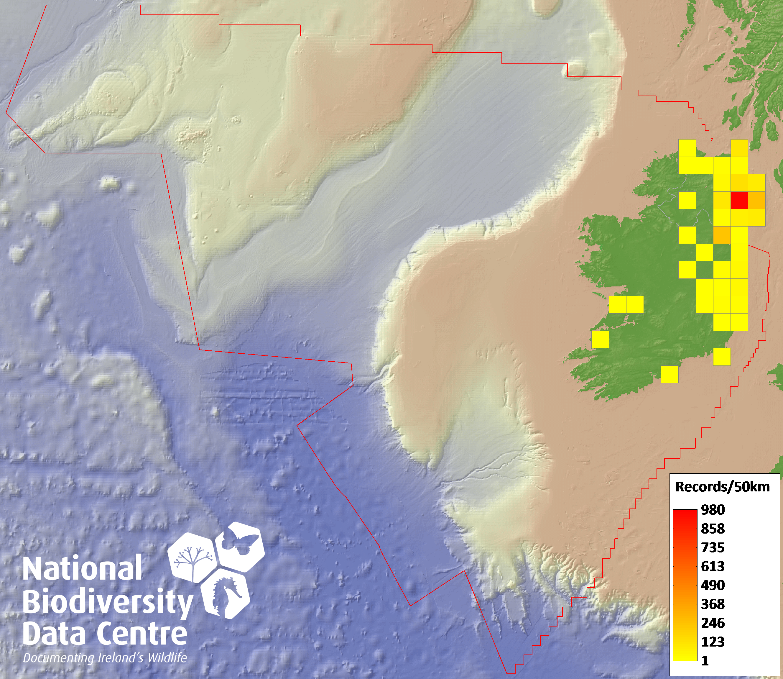 Distribution of the number of records recorded within each 10km grid square (ITM).Marine Map - 50km