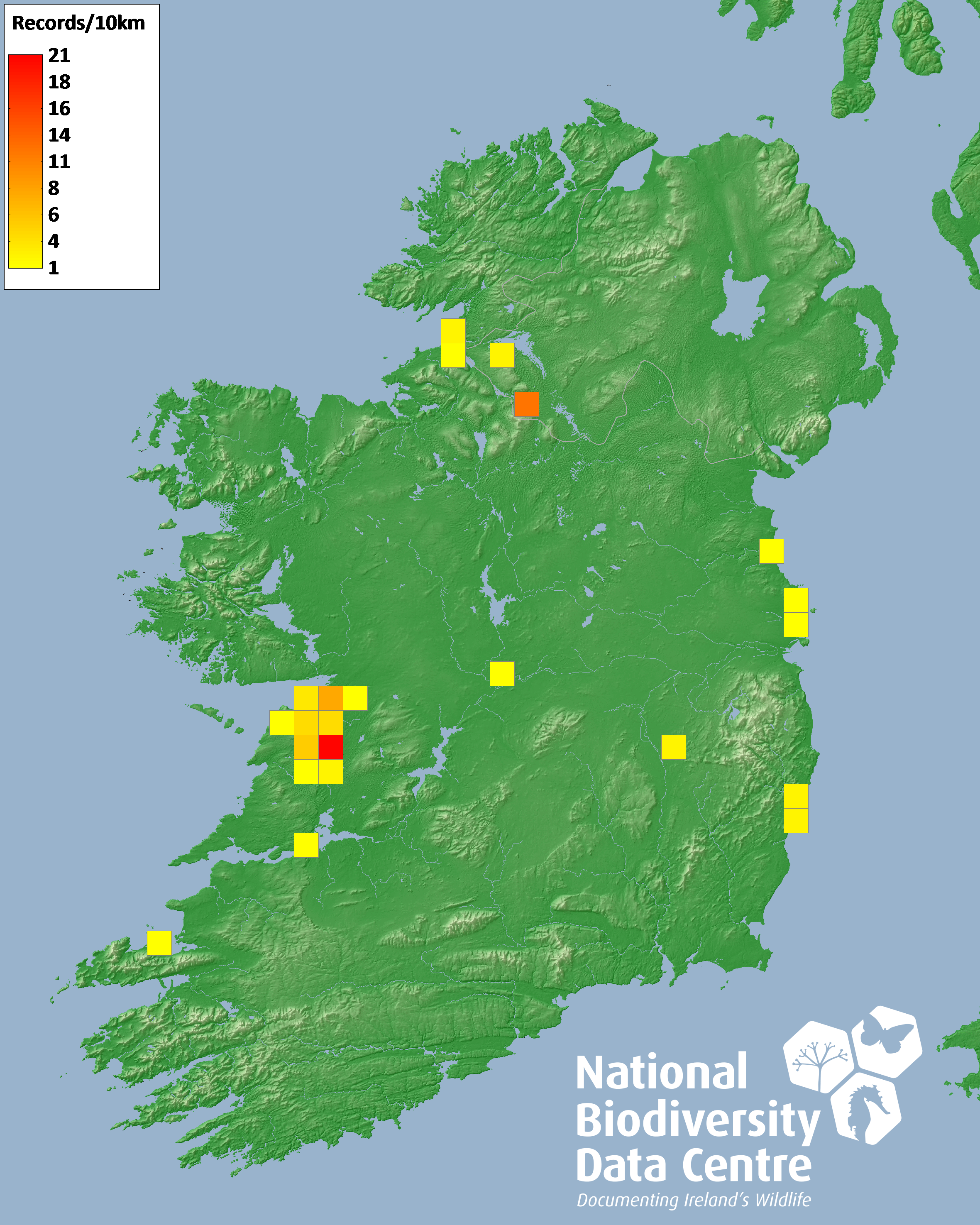 Distribution of the number of records recorded within each 10km grid square (ITM).Marine Map - 50km