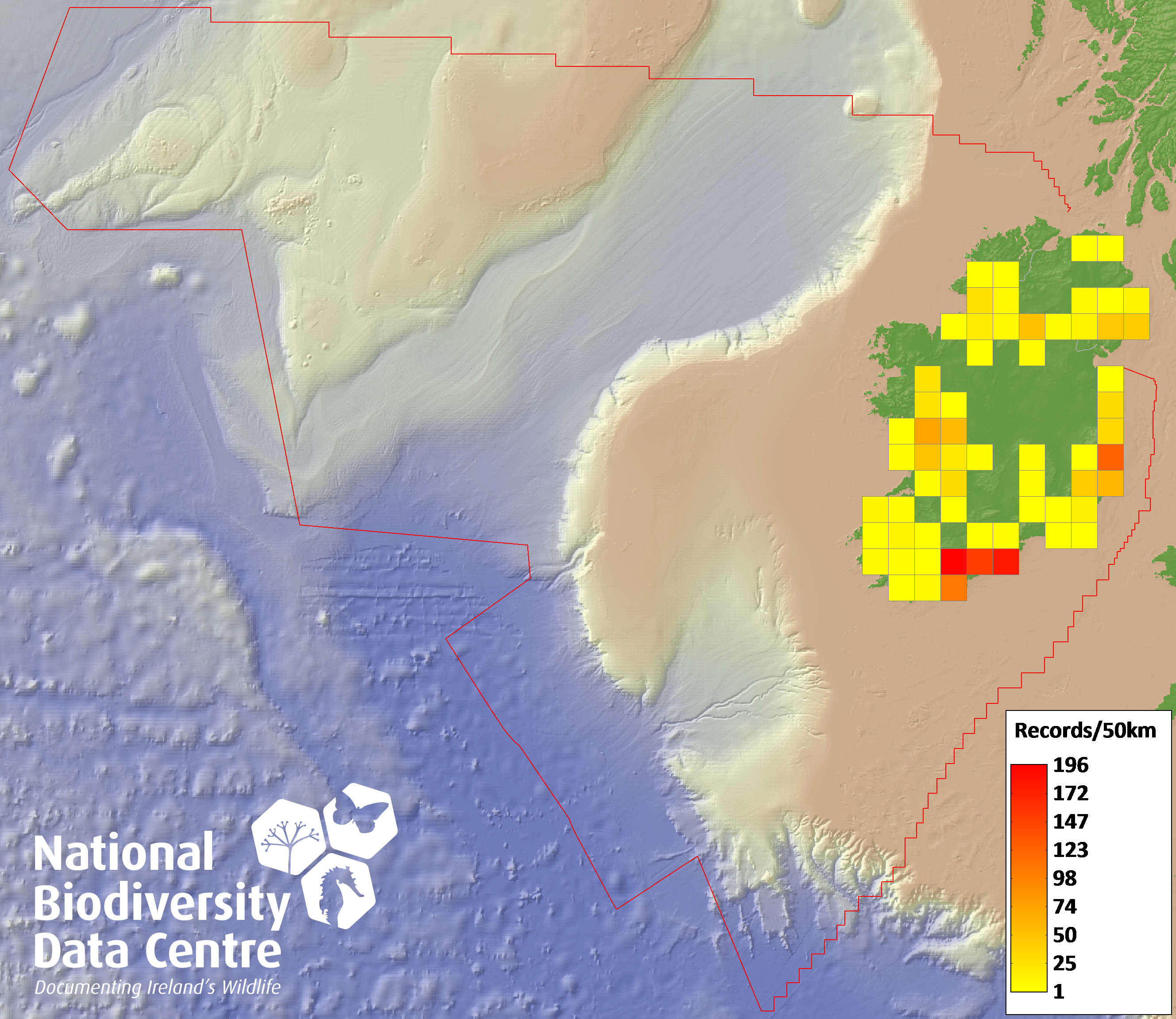 Distribution of the number of records recorded within each 10km grid square (ITM).Marine Map - 50km