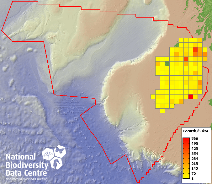 Distribution of the number of records recorded within each 10km grid square (ITM).Marine Map - 50km