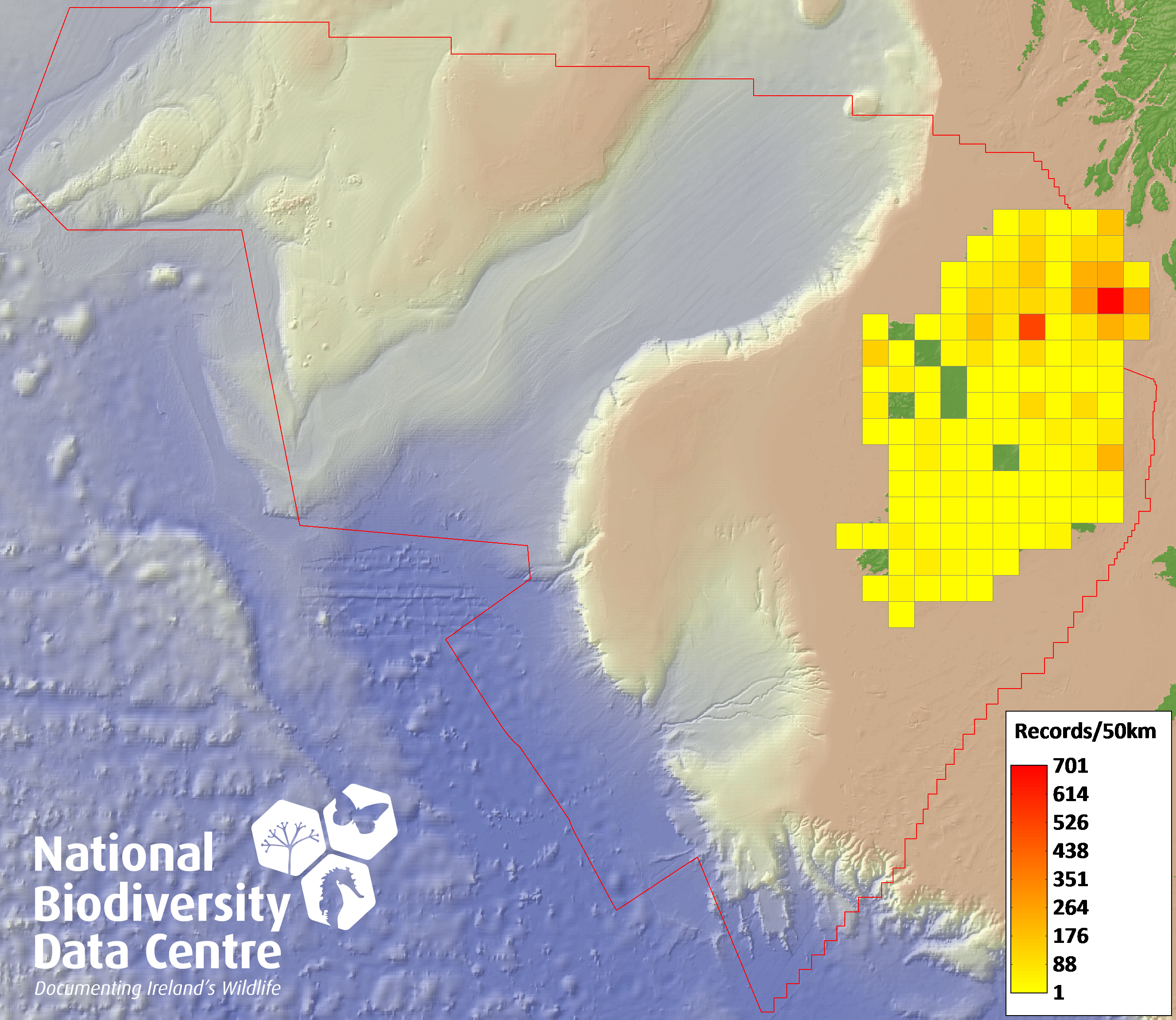 Distribution of the number of records recorded within each 10km grid square (ITM).Marine Map - 50km