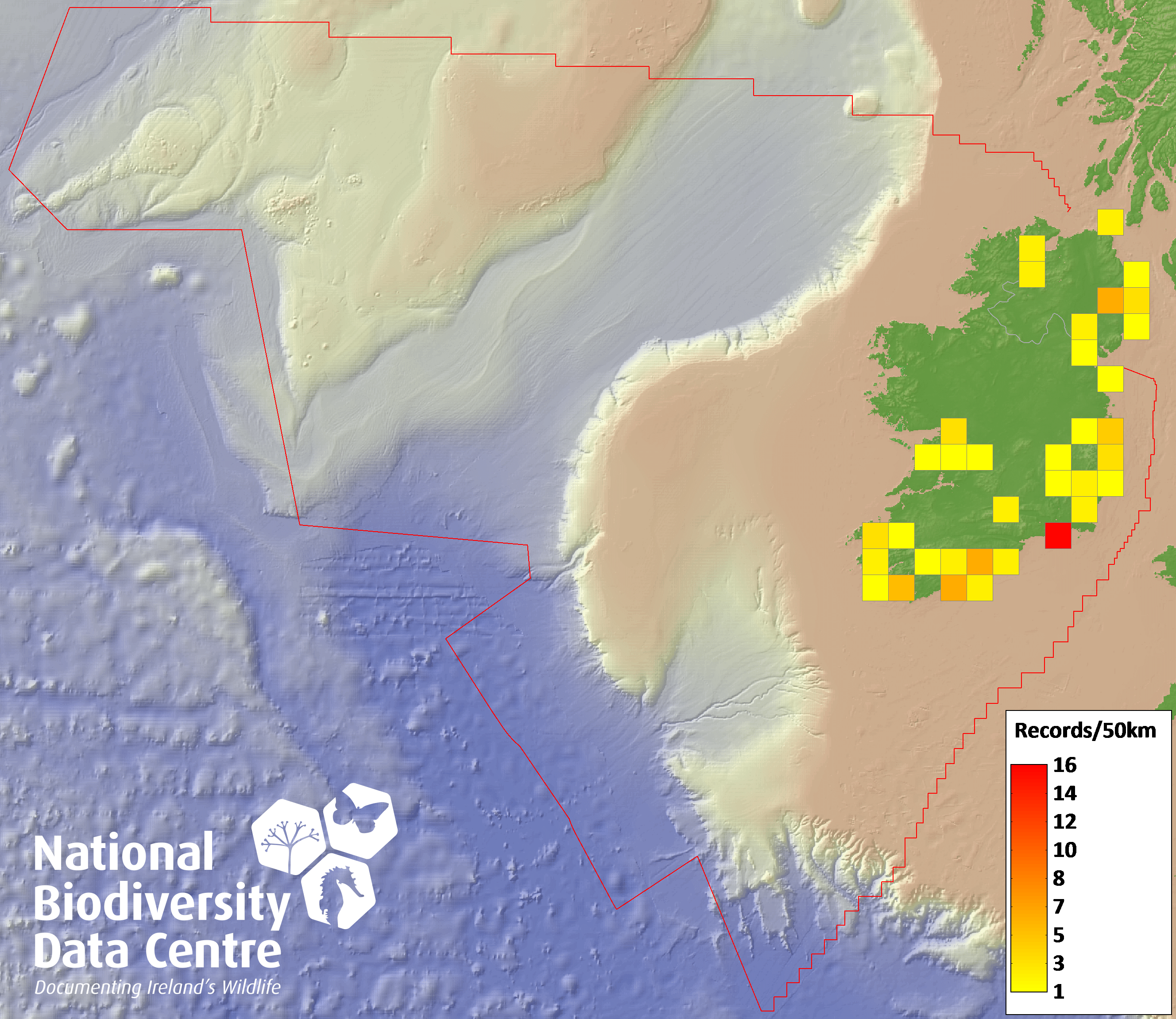 Distribution of the number of records recorded within each 10km grid square (ITM).Marine Map - 50km