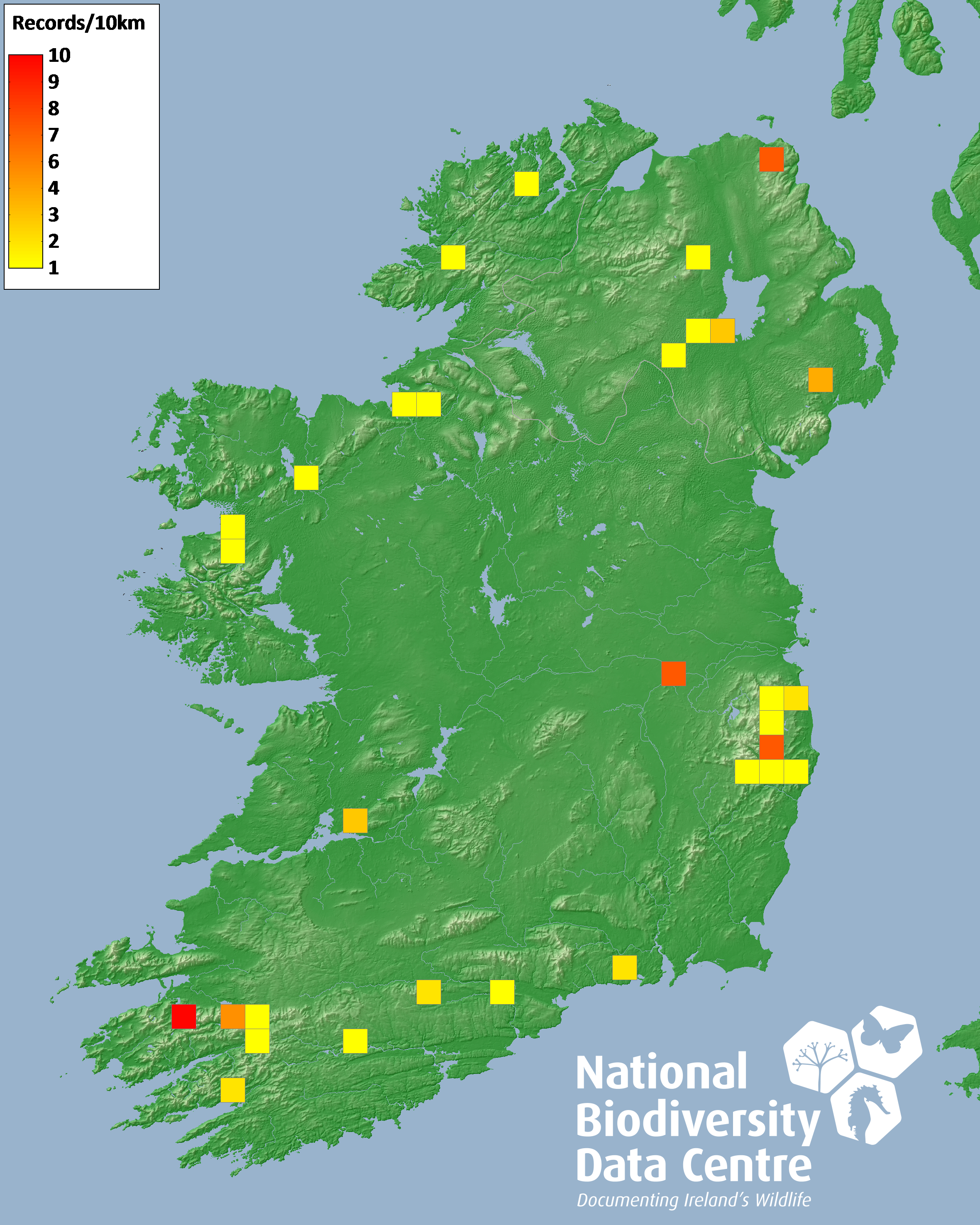 Distribution of the number of records recorded within each 10km grid square (ITM).Marine Map - 50km