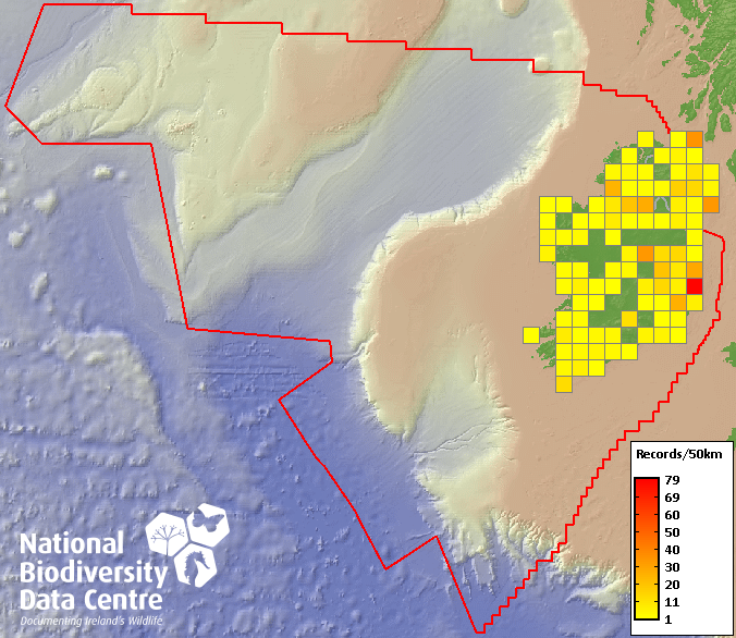Distribution of the number of records recorded within each 10km grid square (ITM).Marine Map - 50km