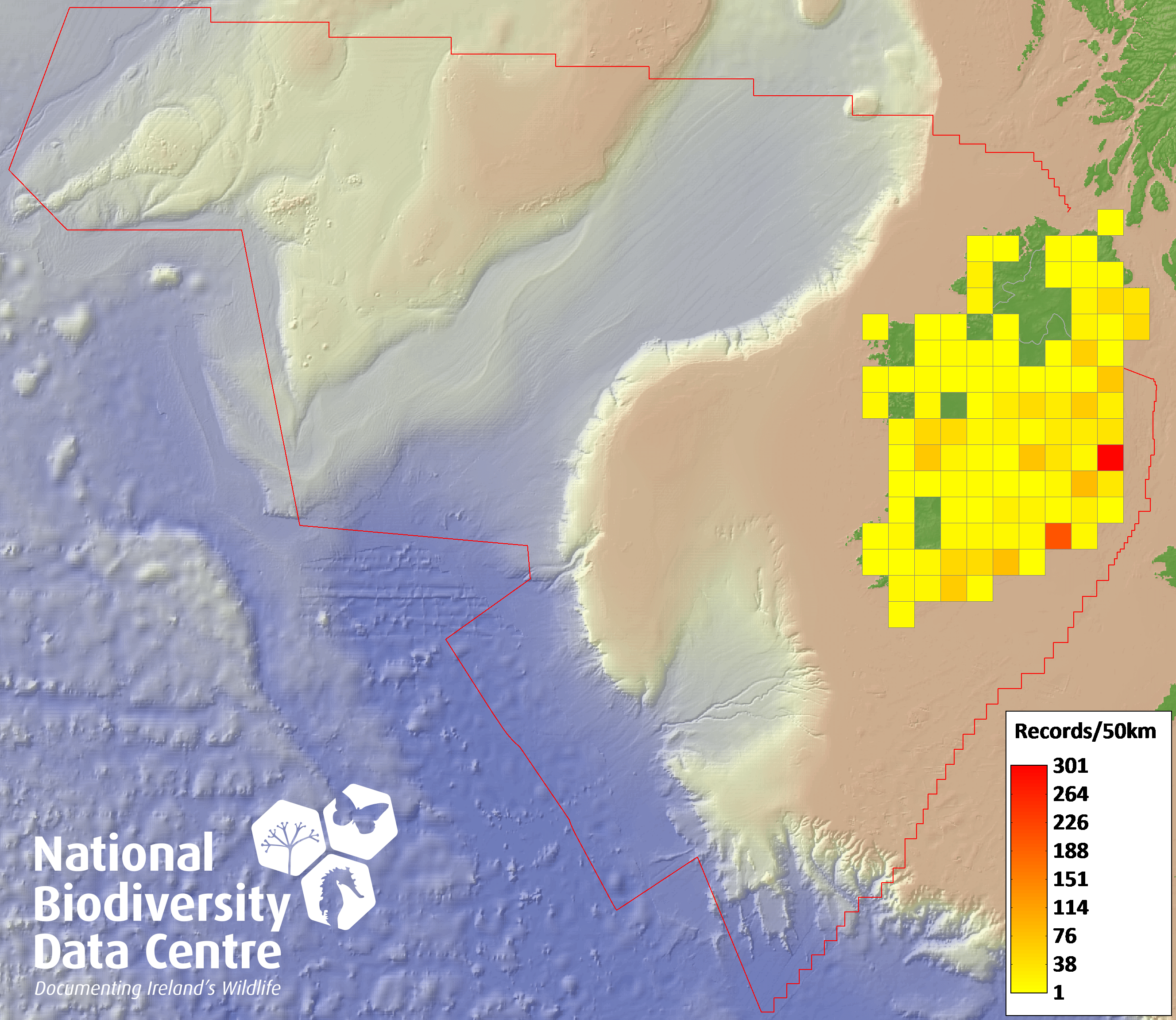 Distribution of the number of records recorded within each 10km grid square (ITM).Marine Map - 50km