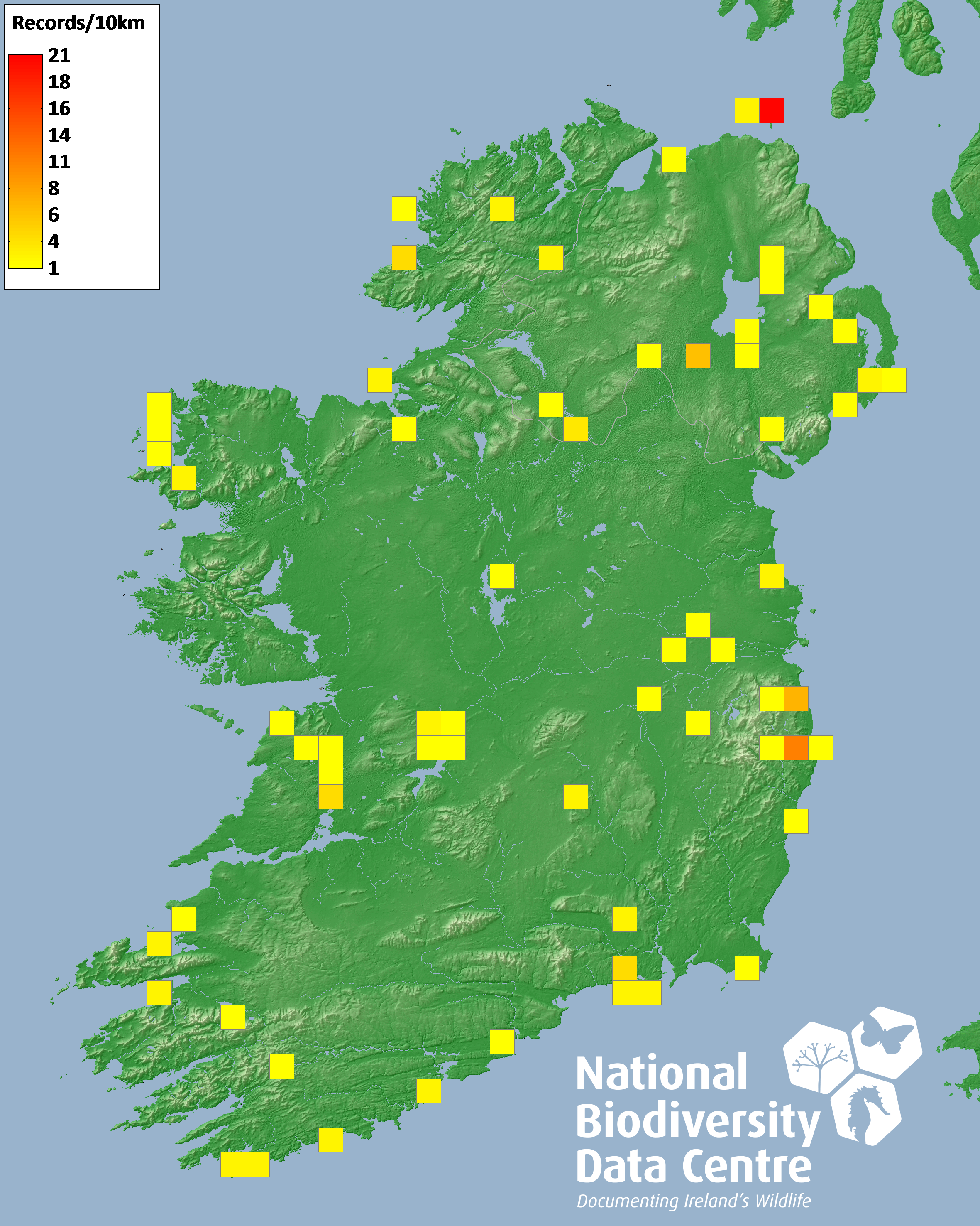 Distribution of the number of records recorded within each 10km grid square (ITM).Marine Map - 50km
