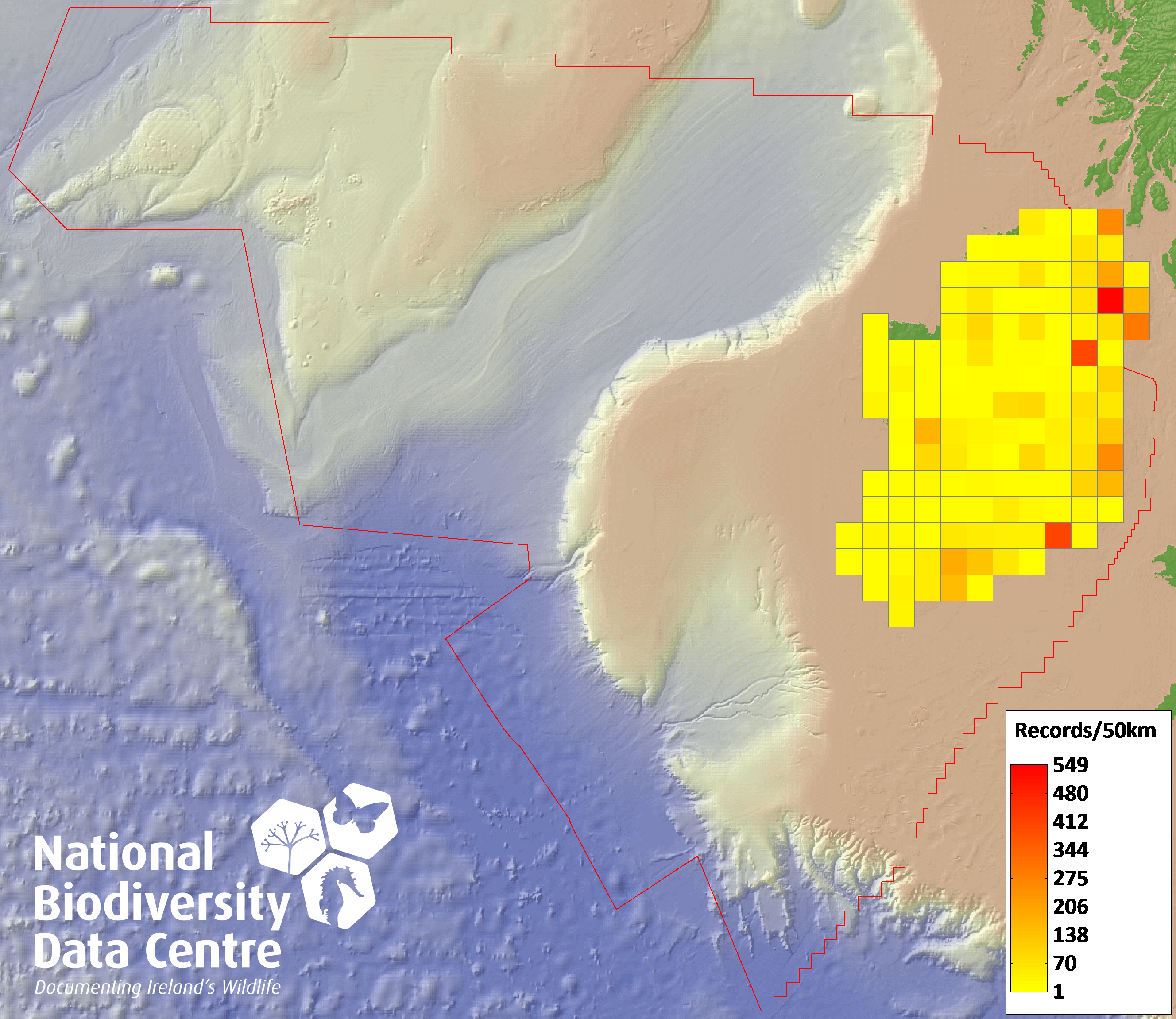 Distribution of the number of records recorded within each 10km grid square (ITM).Marine Map - 50km