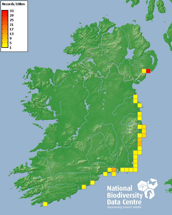 Distribution of the number of records recorded within each 10km grid square (ITM).Marine Map - 50km
