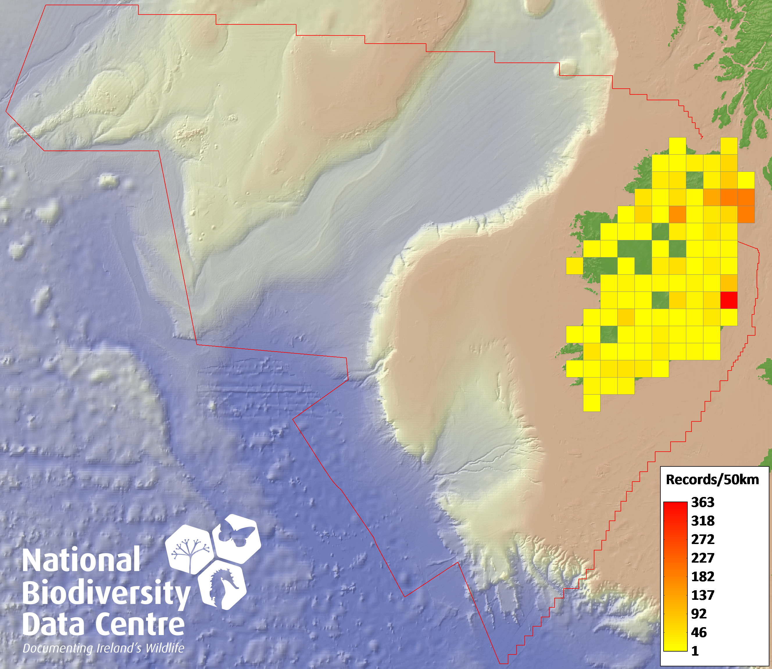 Distribution of the number of records recorded within each 10km grid square (ITM).Marine Map - 50km